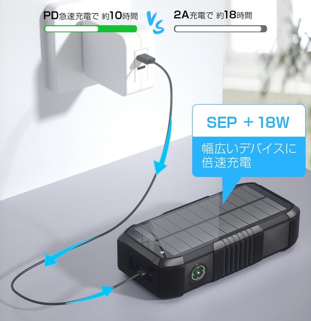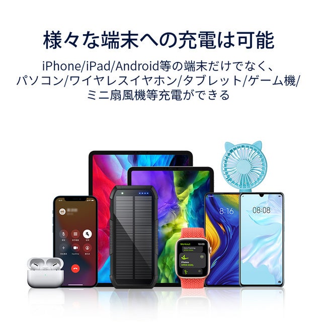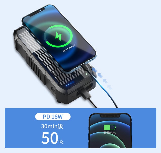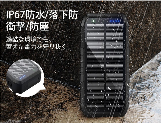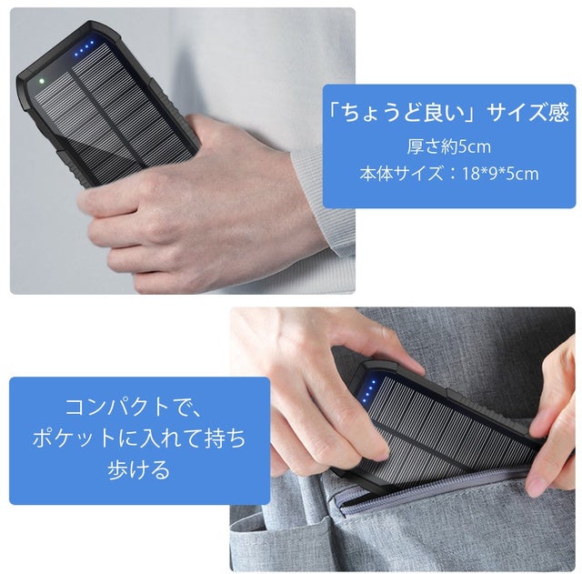 高効率 のソーラーパネルで太陽光も充電できます。アウトドアや災害の時に電源がない場所でも太陽の光さえあれば充電できます。キャップ/野外BBQ/自転車乗り/停電など様々なシーンで活躍できます。防災グッズ、避難グッズとして1台あれば 助かります。