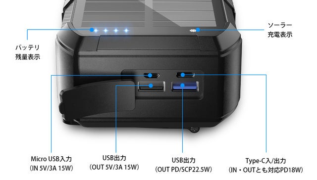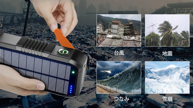 手回し/ソーラー発電・IP67防水・ケーブル内蔵・方位磁石・6台同時充電など多彩な機能を搭載!