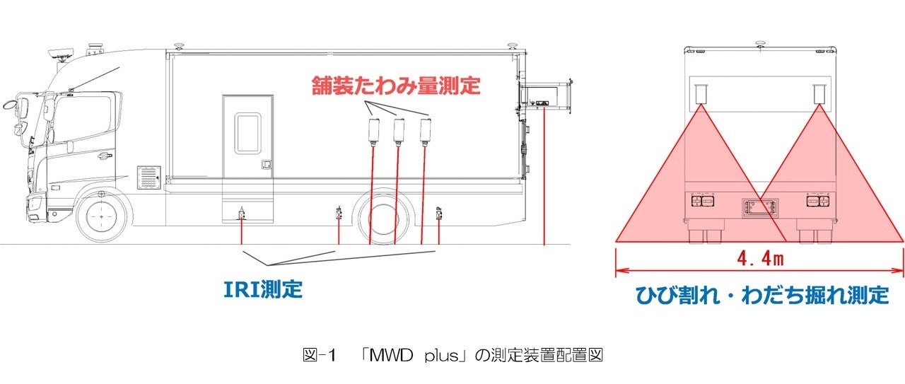 これらを背景に,当社では共同研究の成果を生かし,舗装のメンテナンスに必要な路面性状の3要素(ひび割れ率,わだち掘れ量,IRI)を自動測定することを目的に使用されている路面性状測定車にMWDを搭載した新たな測定車両「MWD plus」を開発し運用を開始しました。