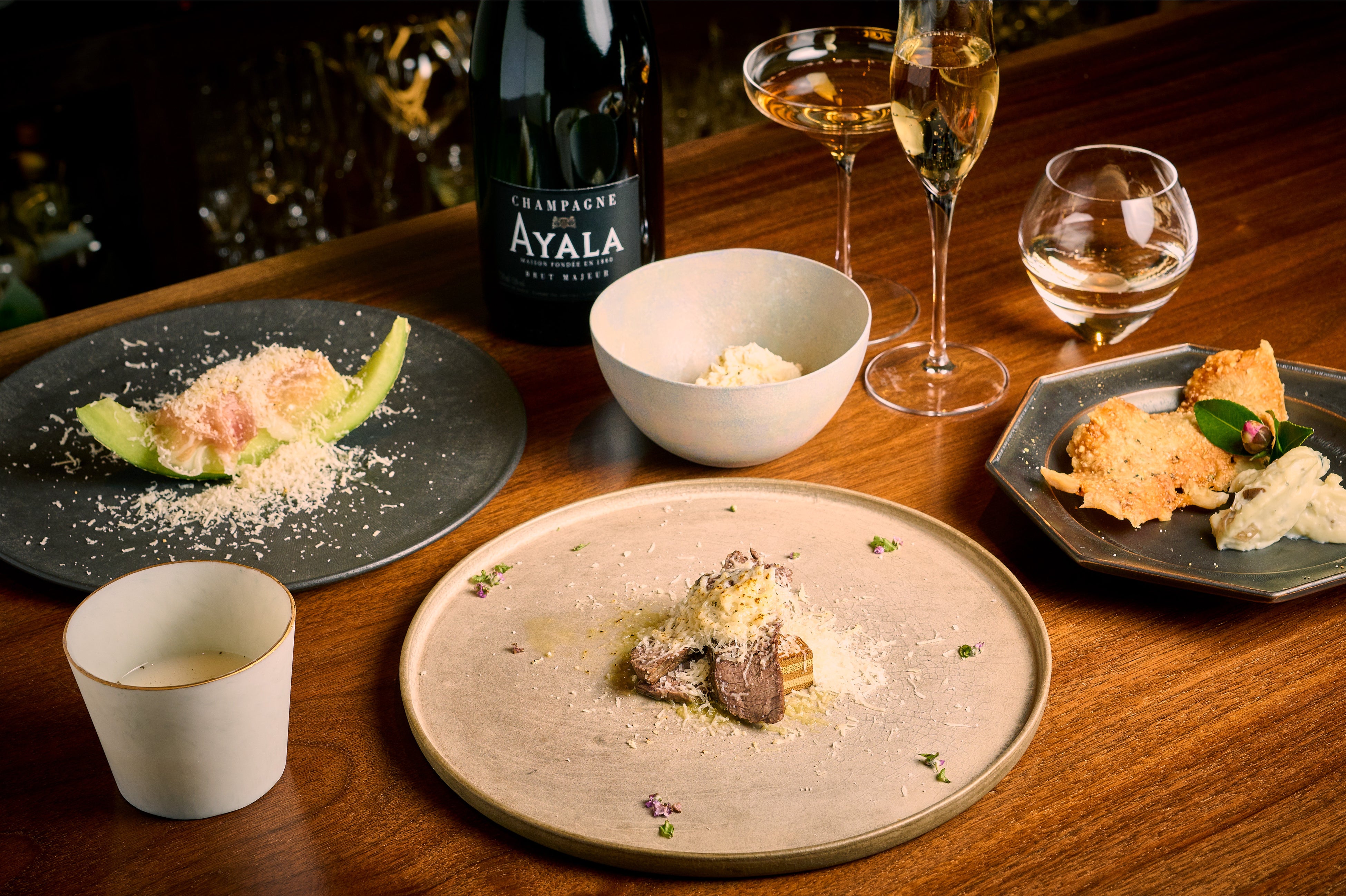 ②お凌ぎ お料理「生ハムとメロン パルミジャーノレッジャーノ」 カクテル「フレンチ75」