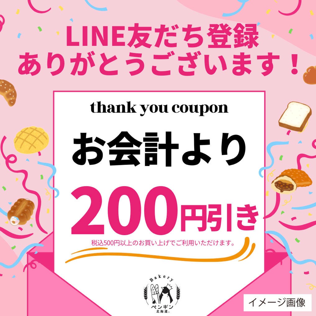 また、この機会に新規でペンギンベーカリー平塚河内店のLINE友だち登録された方全員に新規友だち特典として、お会計より200円割引になる「200円引きクーポン」も配布中。LINE友だち登録したその日に使えるので、さらにお得にお買い物することができます。※