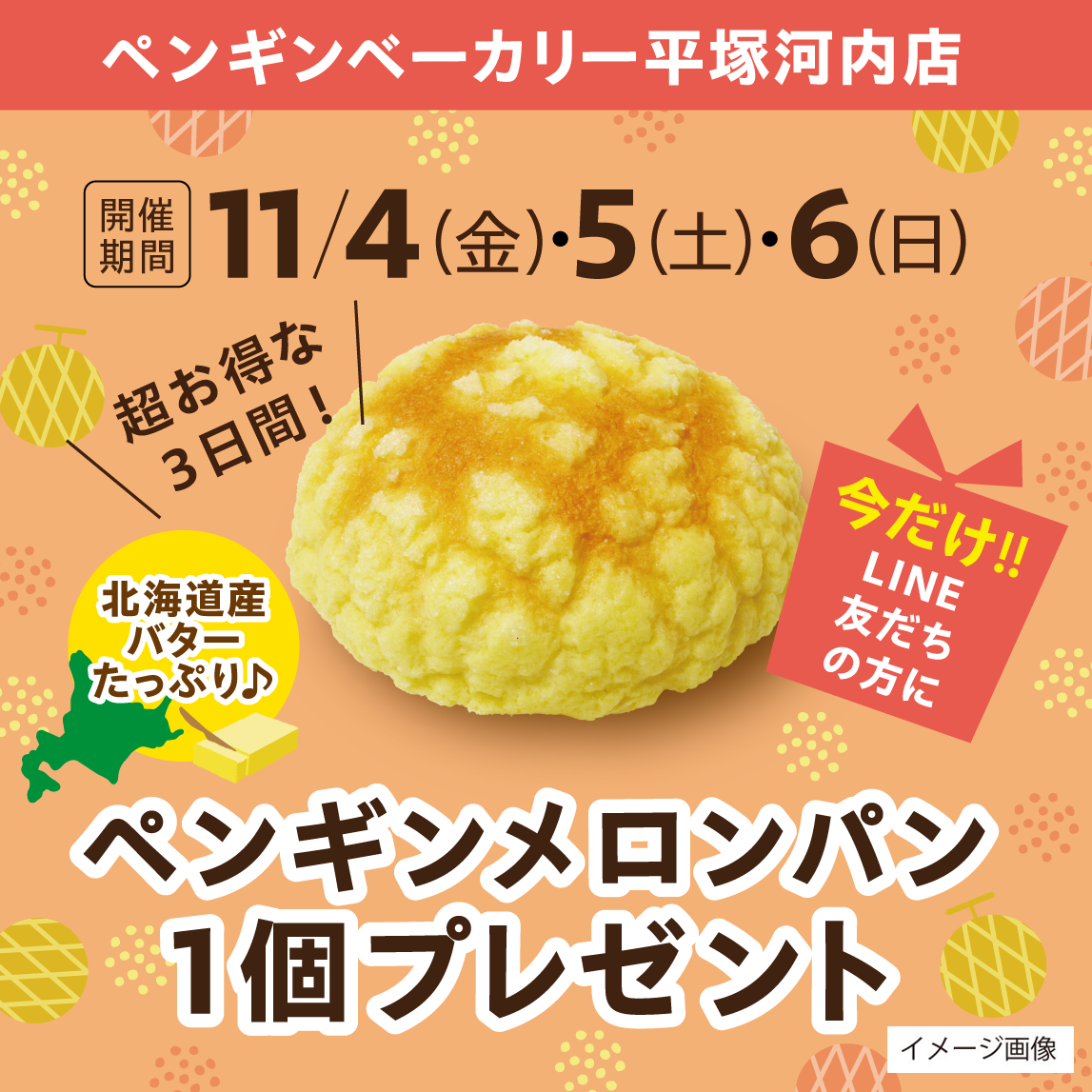 特 典 : 期間中、LINEクーポンを提示いただいたお客様に「ペンギンメロンパン」1個プレゼント