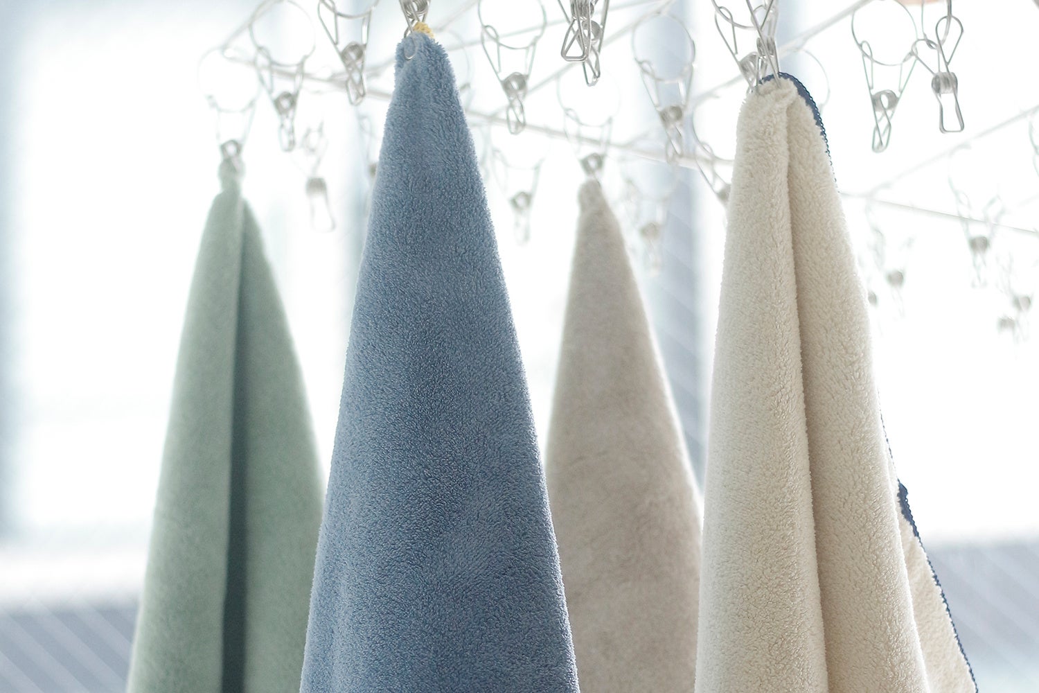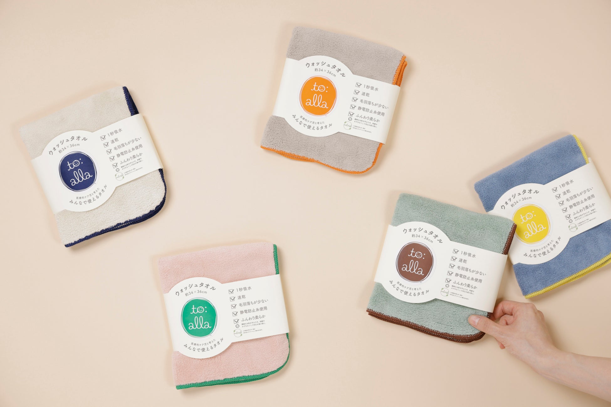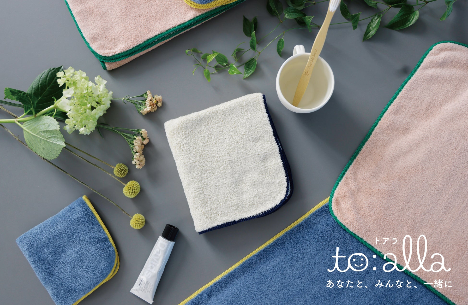 そこで、特別な形状を作らなくてはという思いを取り払い、家族も友達もみんなで使えるものとして、吸水性と速乾性に優れ、ふんわり柔らかいマイクロファイバー製のタオルをto:alla(トアラ)の第一弾商品として開発しました。
