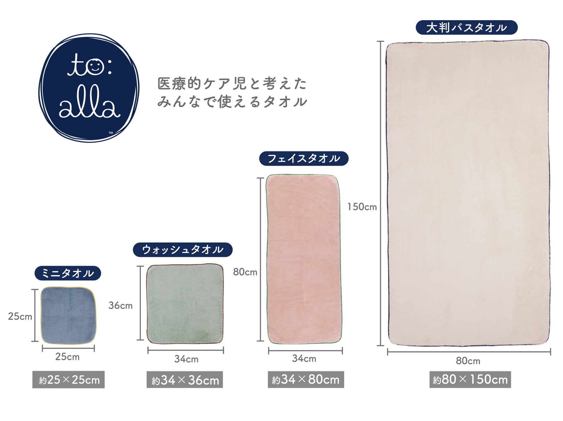 タオルを多数使用し、頻繁に買い替えの必要があるご家庭にも手に取りやすい低価格帯です。また、to:alla(トアラ)の売り上げの一部はNPO法人アンリーシュへ寄付され、医療的ケアが必要な子どもの生活情報の充実、医療的ケア児家族が輝ける場の創出に役立てられます。