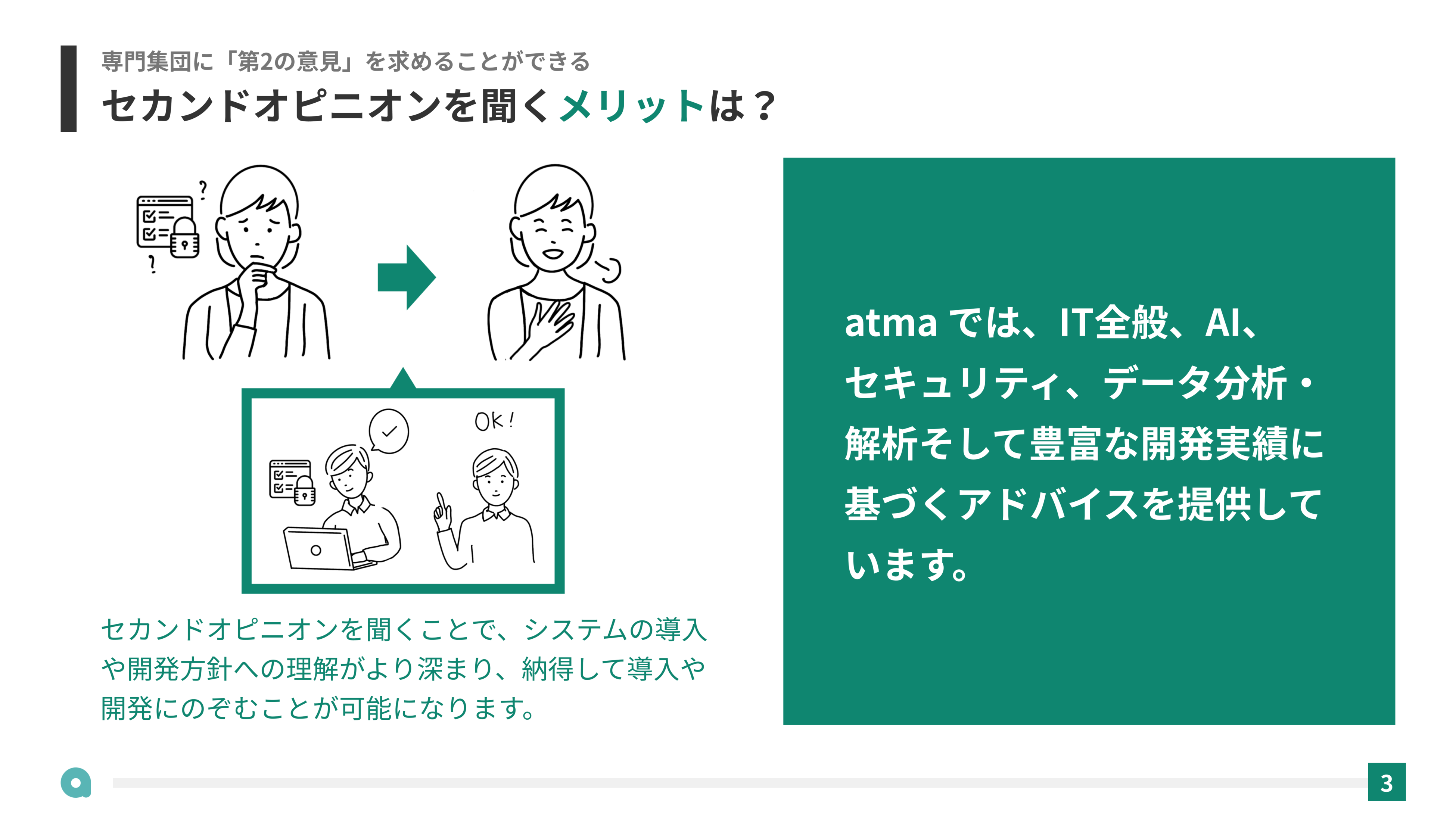 開発方針や技術選定などについて、現在お取引中の開発業者様、社内の開発中のプロダクトとは別に、atma のエンジニアやコンサルタントに「第2の意見」を求められます。