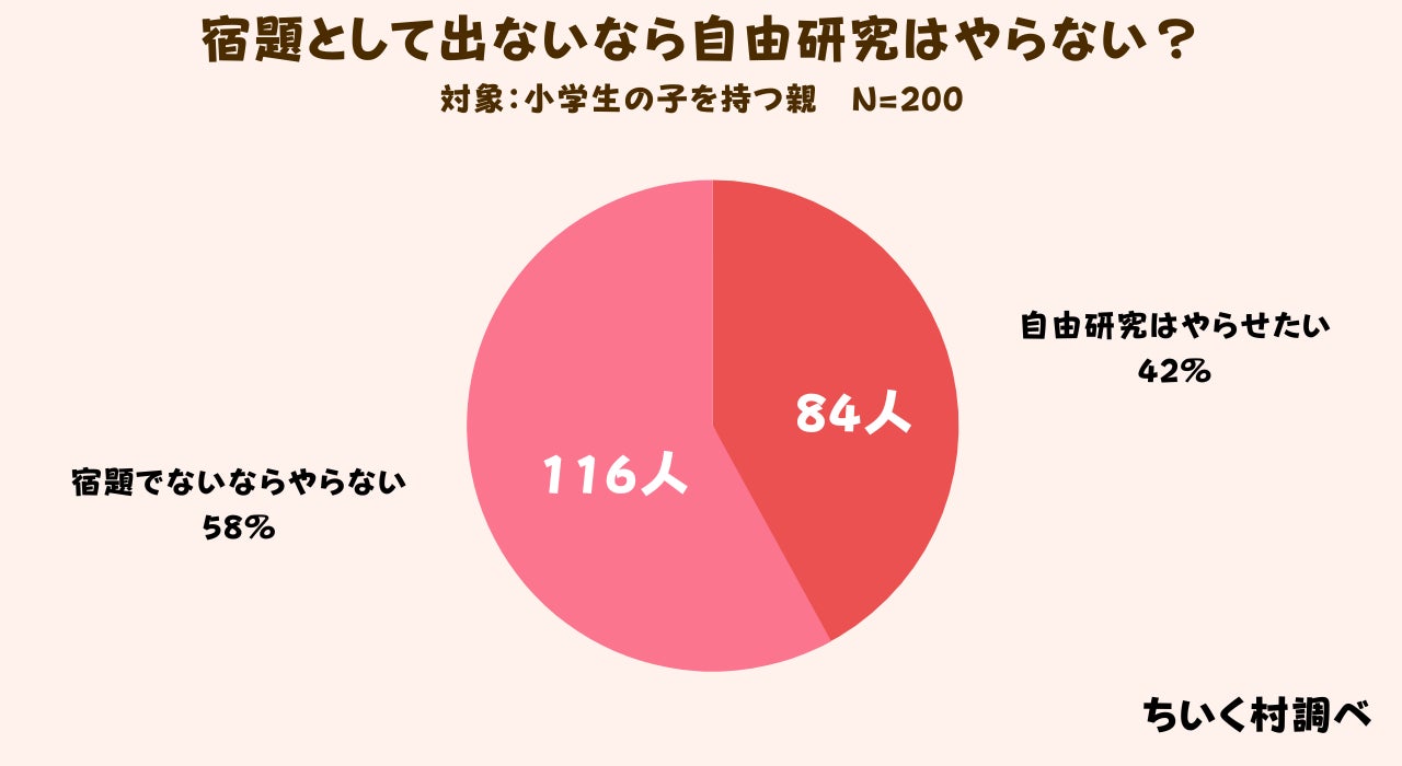 やはり、夏休みの自由研究は親にとって負担になっているようです。宿題だからしぶしぶやっているが、宿題として出ないなら自由研究はやらない、という人の方が多数派のようです。