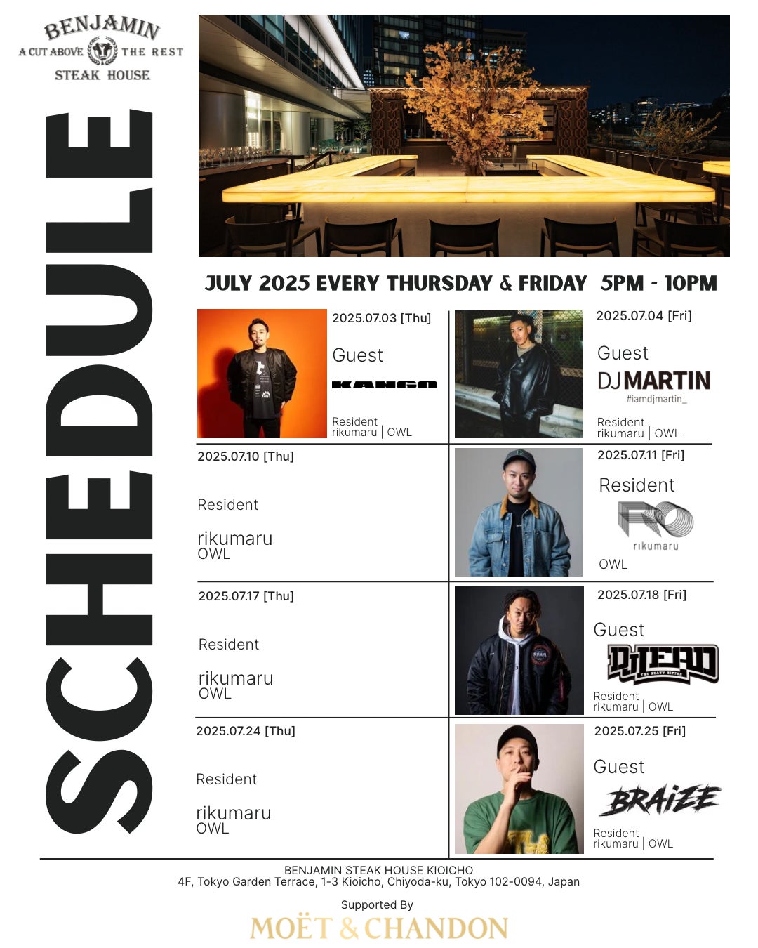 2025年7月3日(木)から、ベンジャミンステーキハウス紀尾井町店『BENJAMIN MUSIC TERRACE - Supported By MOËT & CHANDON – 』が期間限定で開催。