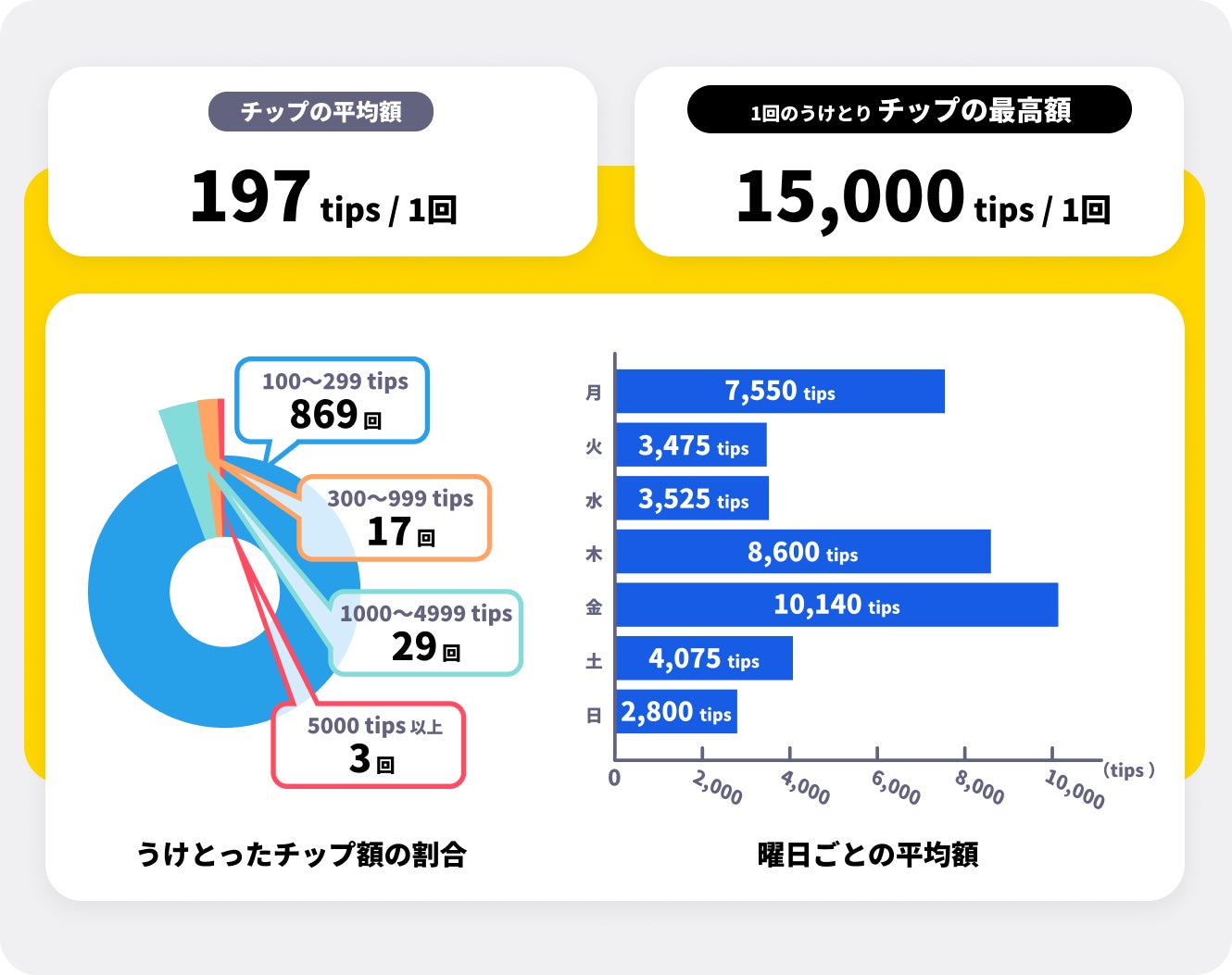 1日平均で32回のチップうけわたしが発生しており、平均して1日に6,013tips(※1)がチップとして頂く結果となりました。