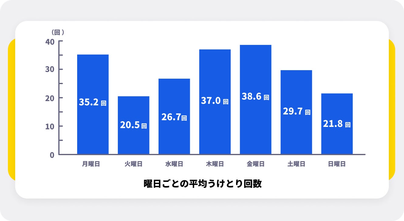 最多は金曜日の38.6回となり、週末に向けてより多くのチップ授受が回数が多い結果となりました。