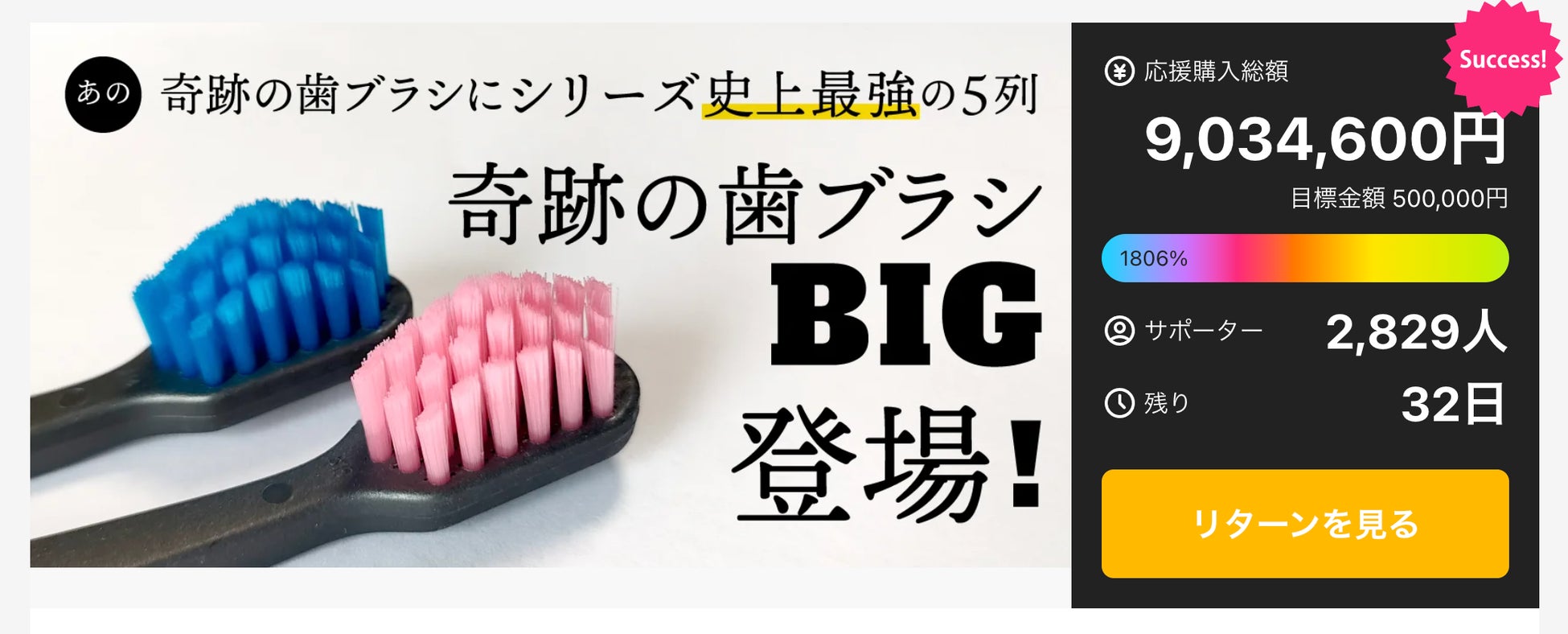 シリーズ累計2,000万本突破の大ヒット!『奇跡の歯ブラシ BIG』、Makuakeで支援総額900万円・支援者数2,800人を突破!