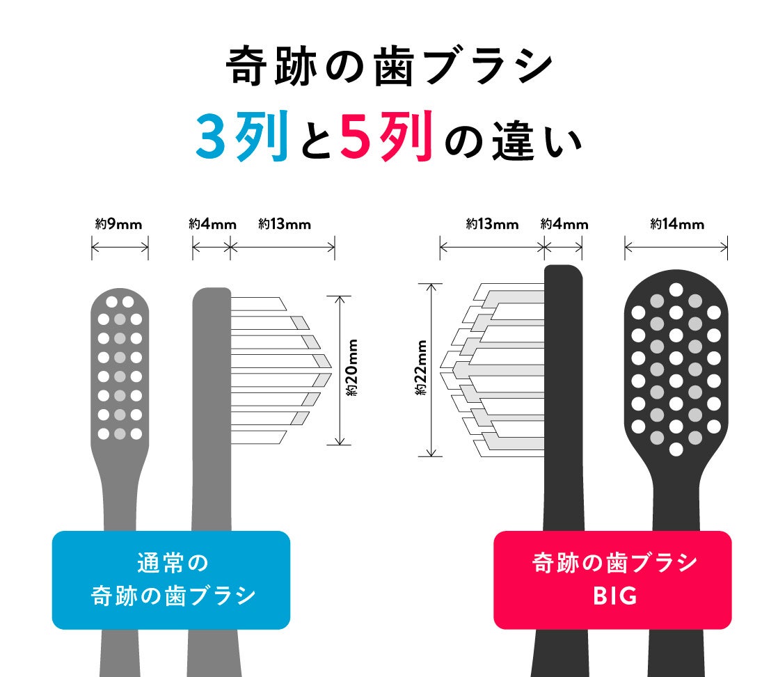 「奇跡の歯ブラシ」シリーズは、これまで累計販売2,000万本を突破し、多くの方々に愛されてきました。今までの奇跡の歯ブラシを超えるような、さらにすごい歯ブラシを作りたい!その想いが5列の奇跡の歯ブラシBIGの誕生に繋がりました。近年では海外のお客様にも認知され始めたことをきっかけに、私たちは日本だけでなく、世界中の人々の歯を守りたいという想いを形にしたのが、新商品の「奇跡の歯ブラシBIG」です。
