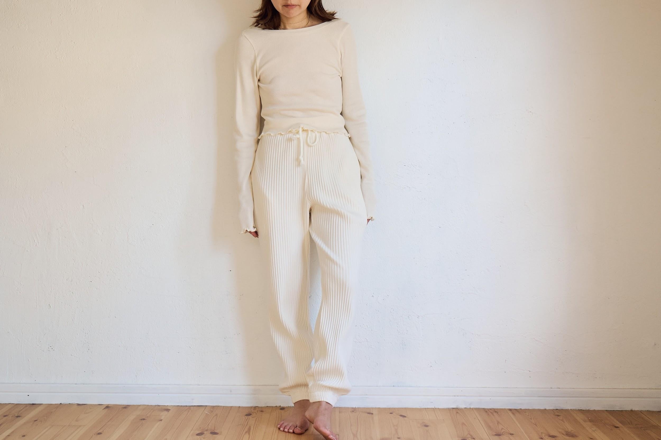 伸縮性のあるワイドリブでストレスフリーな履き心地。ウエストゴム部分にパイルを使用することで肌当たりが柔らか。カジュアルになり過ぎないラインが特徴のパンツです。