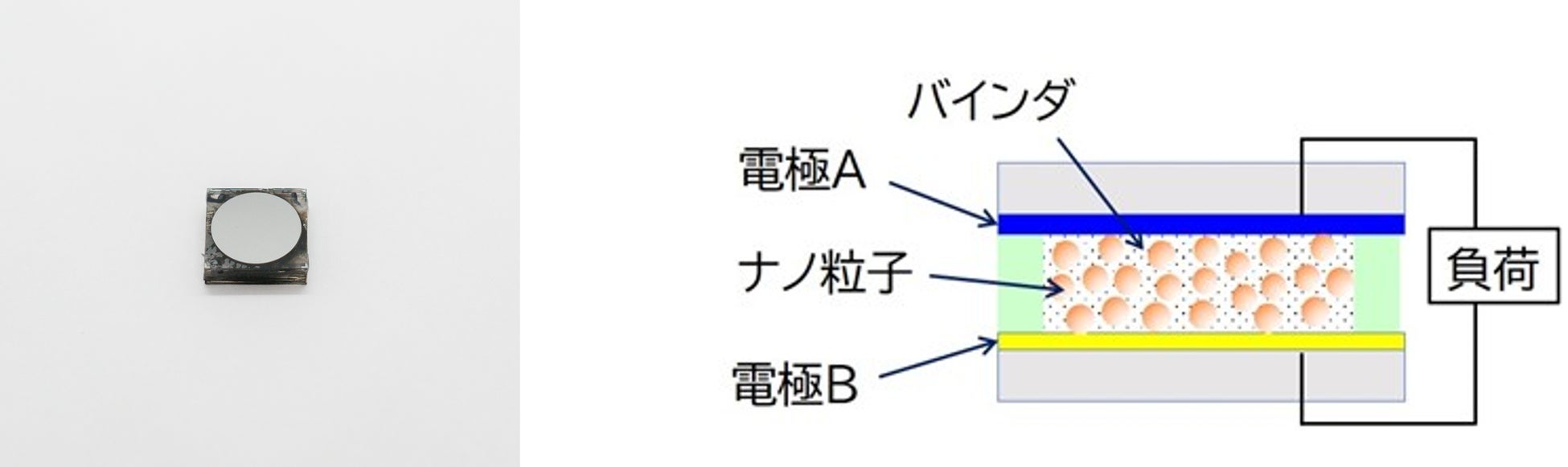 2つの電極と合金ナノ粒子を高密度で分散した固体膜から構成され、一方の電極から放出される電子が、ナノ粒子を介して、他方の電極にホッピング現象により伝搬することで発電する仕組みです。構成が簡素なこと、温度差を用いない発電機構であることから、大面積化、積層化が可能となり、従来の熱エネルギー変換技術では困難だった、大出力の発電機器としての適用も実現します。