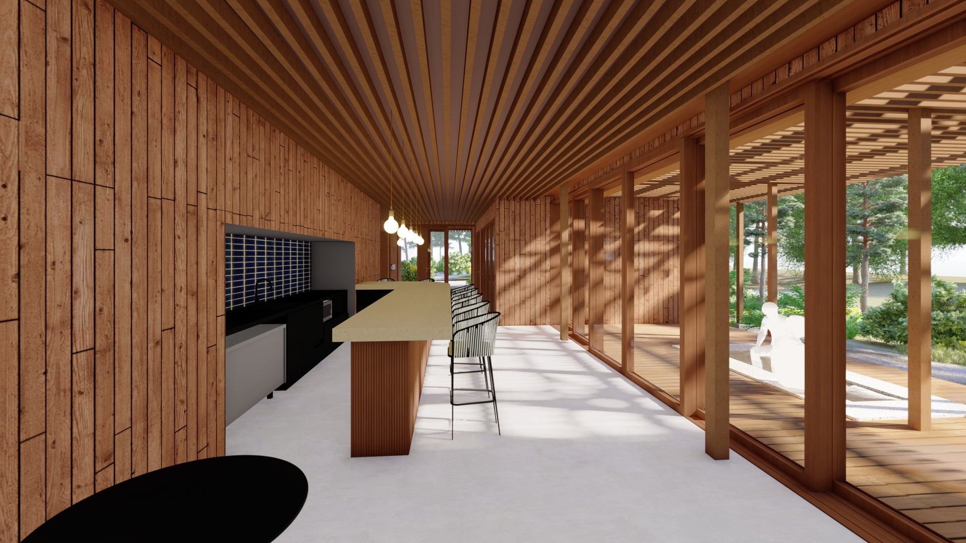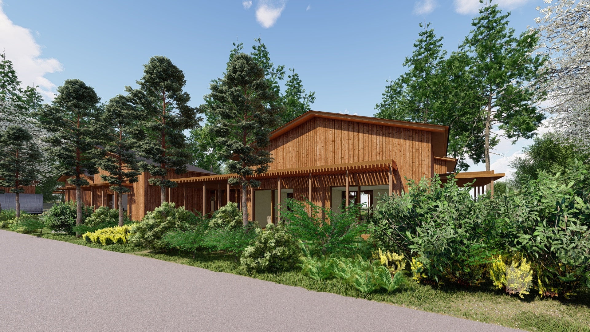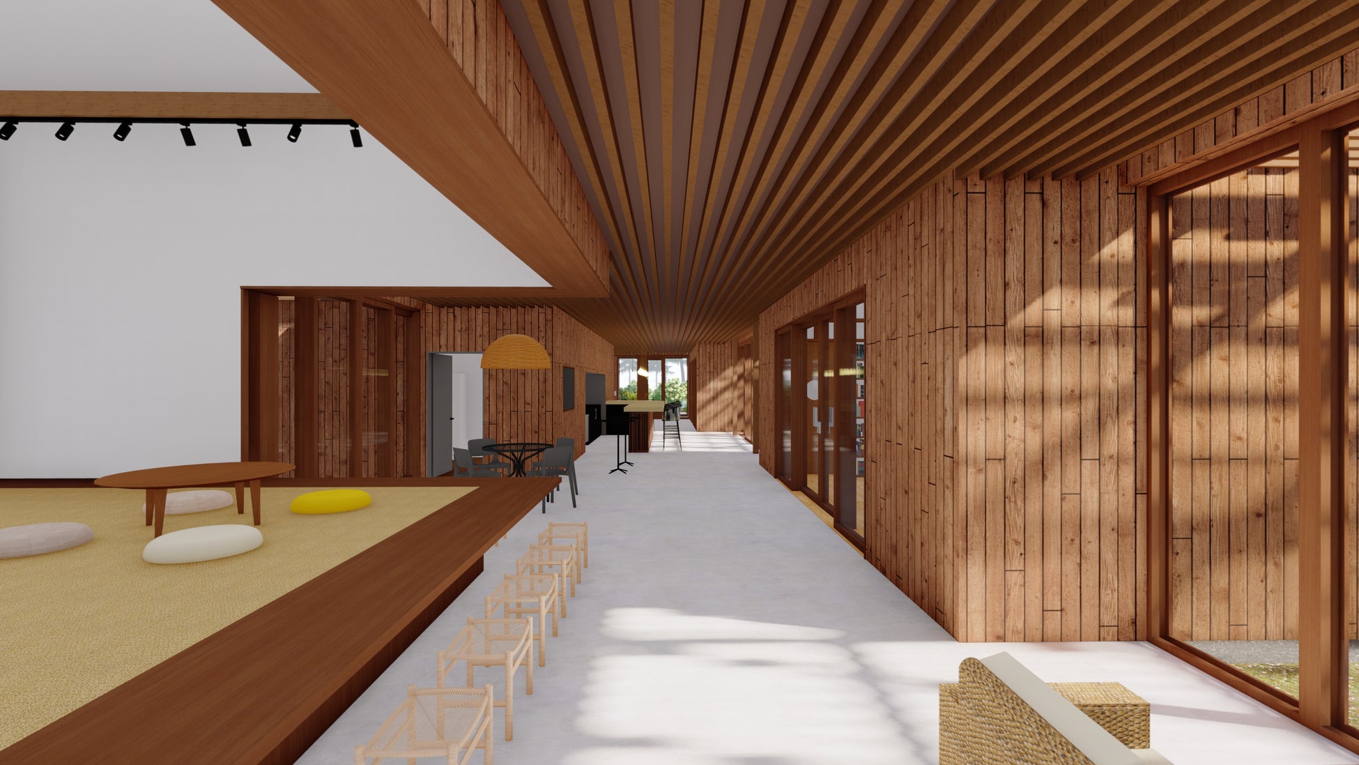 脱炭素化のために、この建物は木造で作られており、それぞれの棟は、中条周辺に見られる木造の民家のように切妻の屋根を持っており、外壁も木の羽目板で仕上げられています。6つの棟が集まる姿は古くからの集落のような佇まいとなっています。棟と棟の間には、外部空間が貫入しており、その隙間から奥行きのある中央部に光と風を通します。ラウンジ前の隙間には半屋外の足湯もあります。