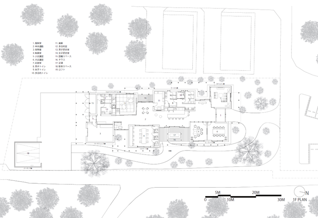 この施設の各棟の隙間の空間は外部の雁木の下に作られた散策路に繋がり、苔やサクラといった魅力的な既存植生や、この地域で天智天皇時代からの育まれてきた油つぼと油井戸の文化と深い繋がりを持つ植栽を楽しむことができます。