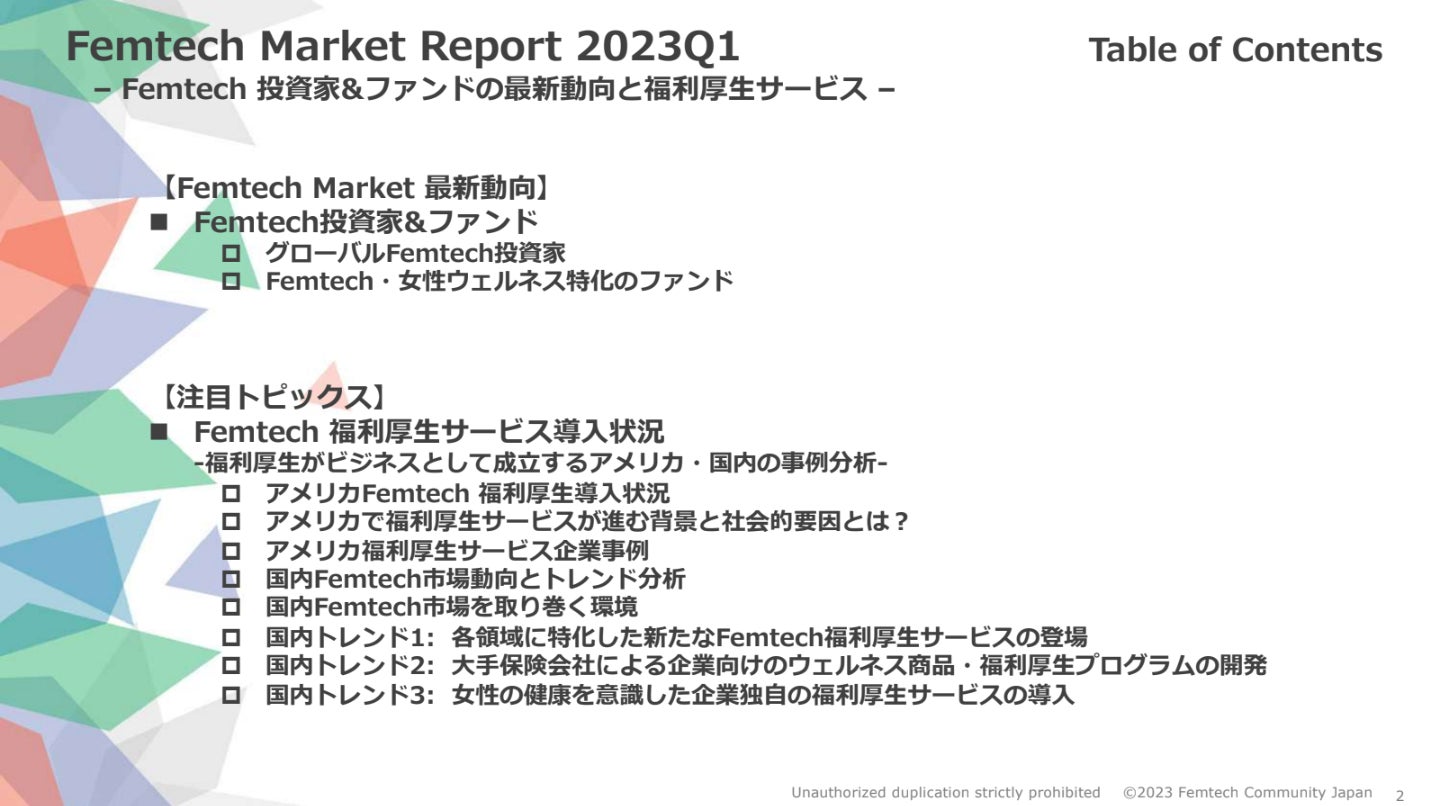 「Femtech Market Report 2023Q1 -Femtech 投資家&ファンドの最新動向と福利厚生サービス-」をリリース