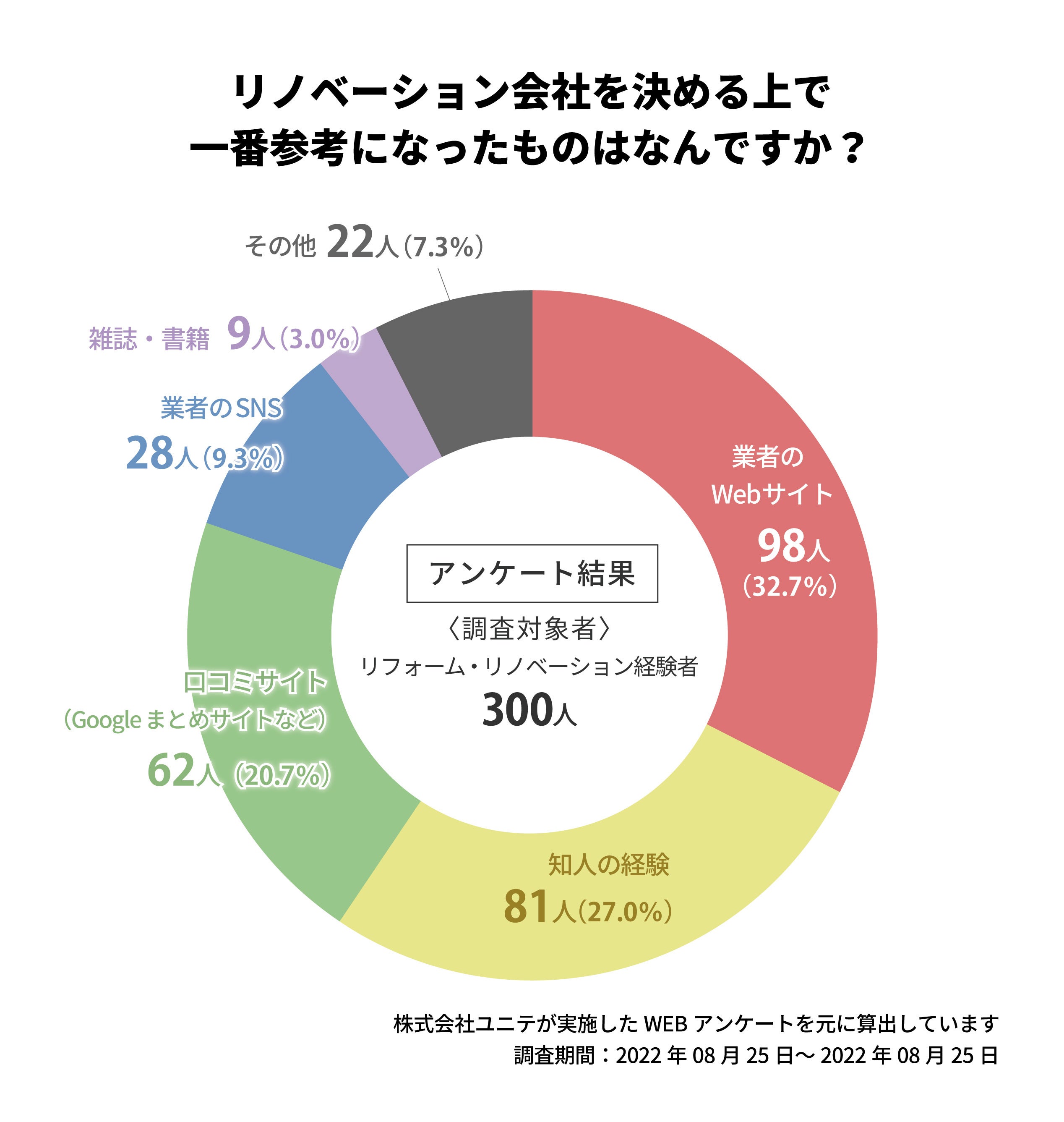 株式会社ユニテ(本社:富山県富山市二口町1-2-7、代表取締役:花井千赴)は、全国300名のリフォーム・リノベーション経験者に対して「リフォーム・リノベーション業者を選ぶ基準に関する調査」を行いました。