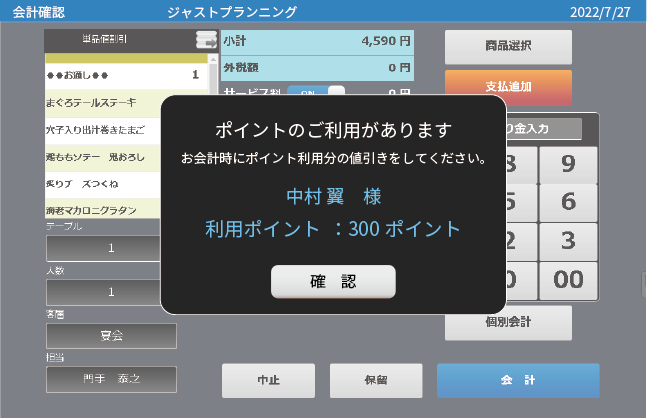 各グルメサイト予約等のポイントの利用がある場合は、会計時にPOSレジにポイント利用のポップアップが表示されるので、会計時にポイント値引き漏れを防ぐことができます。