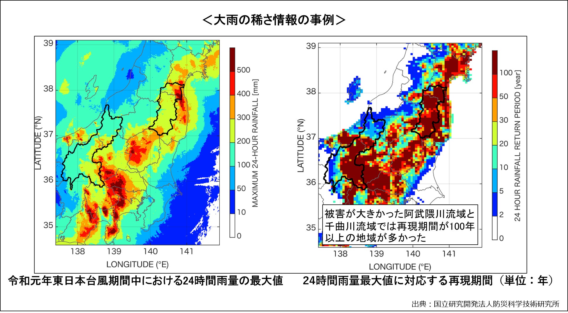 防災科研では、近年の豪雨による災害の多発を受け、より具体的な避難行動を促すため、「大雨の稀さ」データの研究開発を進めてきました。大雨の稀さとは、再現期間という表現を使って観測された降水量が平均して何年に一度くらいの確率で起こるかを表すものです。再現期間が長いということは、その地域にとって滅多にない稀な規模の大雨であることを意味します。この稀さは、過去約30年分における解析雨量に基づき推定されます。通常、インフラの設計には、これまでを大きく上回る稀な大雨は想定されていないケースが多く、その施設の対応能力を超えてしまう可能性があります。今まであまり大雨が降っていない地域は、頻繁に大雨が降るような地域と比較すると、大雨に対する自然・社会環境の脆弱性があると考えられます。したがって、災害が起こる恐れ(危険度)の度合いは、雨量そのものよりもその地域にとってどれくらい稀な大雨であるかの方がより重要な情報になると考えられます。