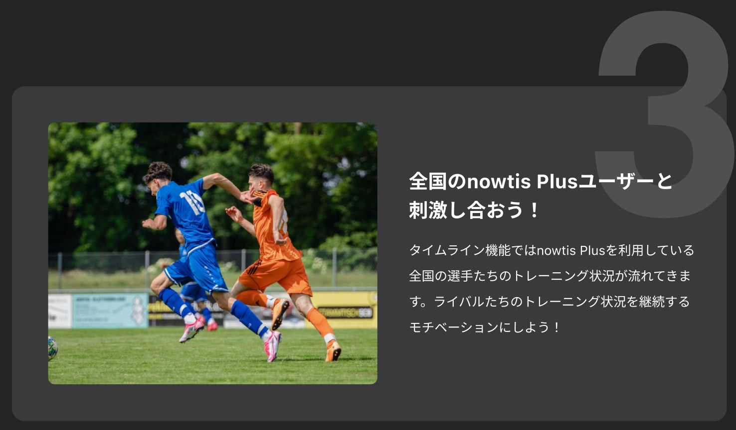 nowtis(ノーティス)は、アスリートのフィジカルテストおよびフィジカルデータの管理アプリを提供しています。サッカーでは全国の強豪チームを中心に200チーム以上、20,000名のフィジカルデータを取得。アプリ内で他チームと比較することで、自分の強み・弱みの特徴を把握し、次のアクションへの気づきを生み出しています。