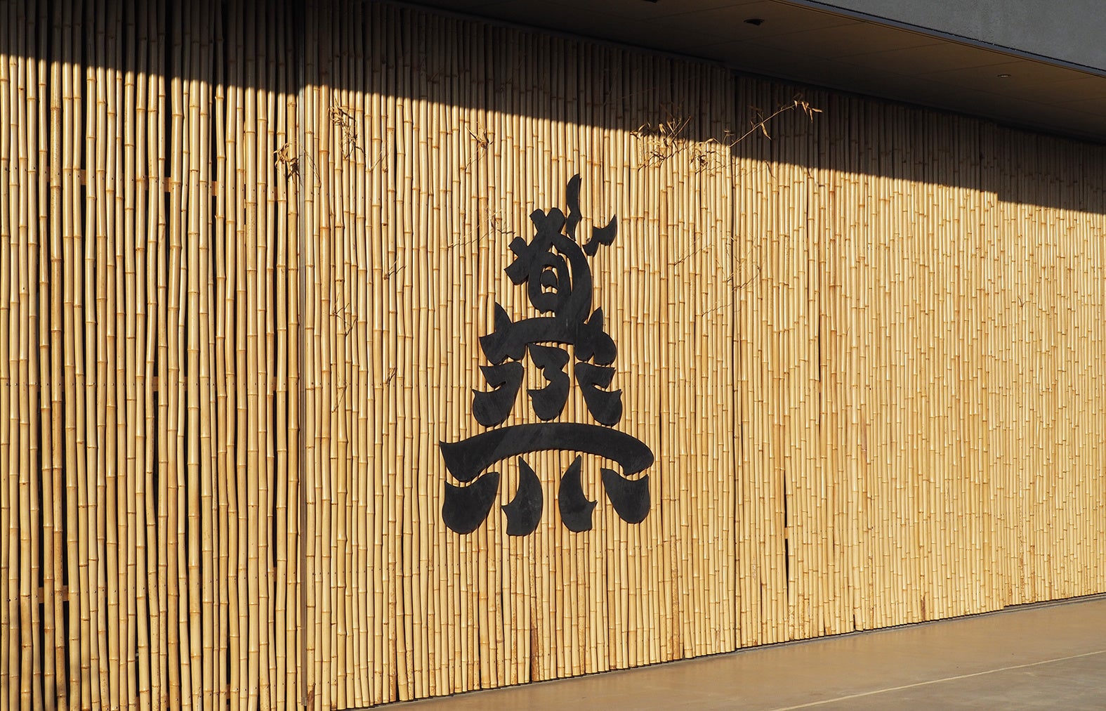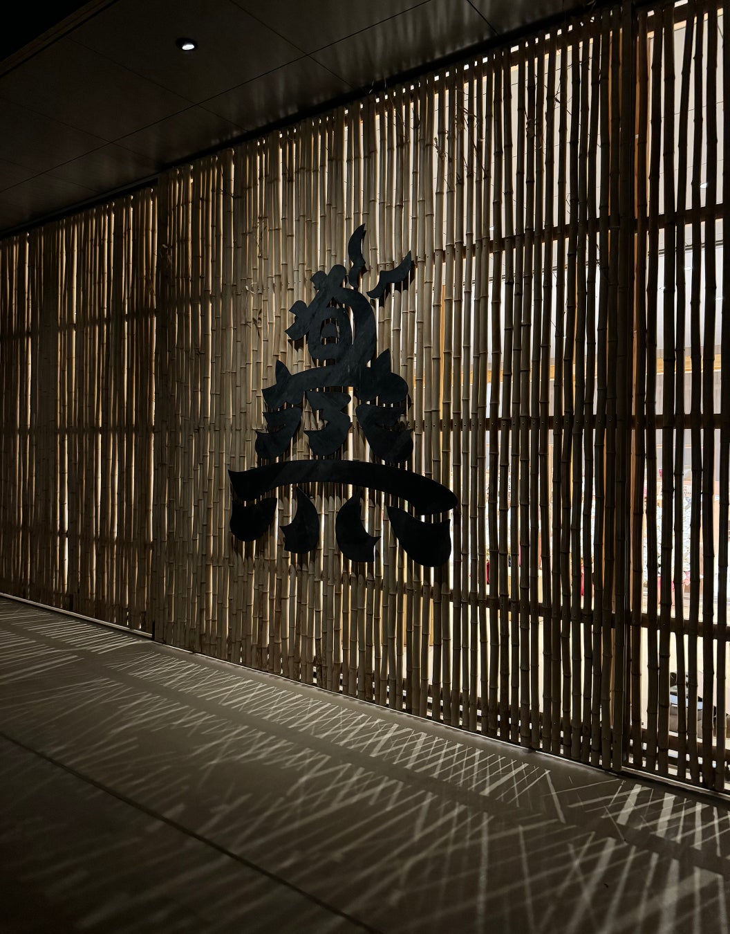 2m近くある竹ルーバーに設置された亜鉛メッキロゴサインは、職人の手切りで制作され、デザインと建築の融合を得意とするIS NEARの真骨頂だ。そのスケール感は見る人を圧倒し、思わず写真を撮りたくなるような大迫力。