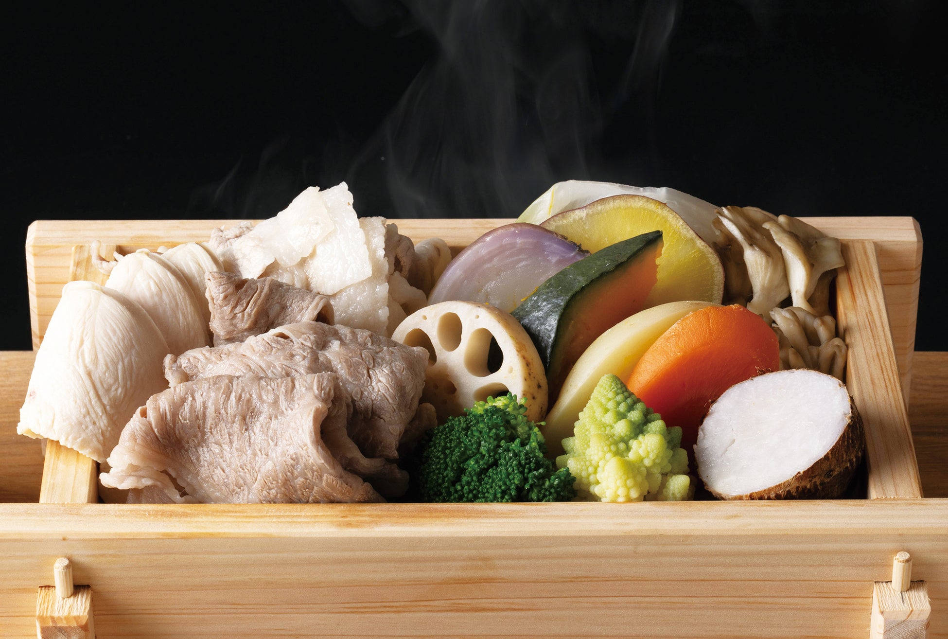 各テーブルには蒸籠があり、湯気が噴き出す様子を眺めながら、鹿児島ならではの蒸し料理を楽しむことができる。