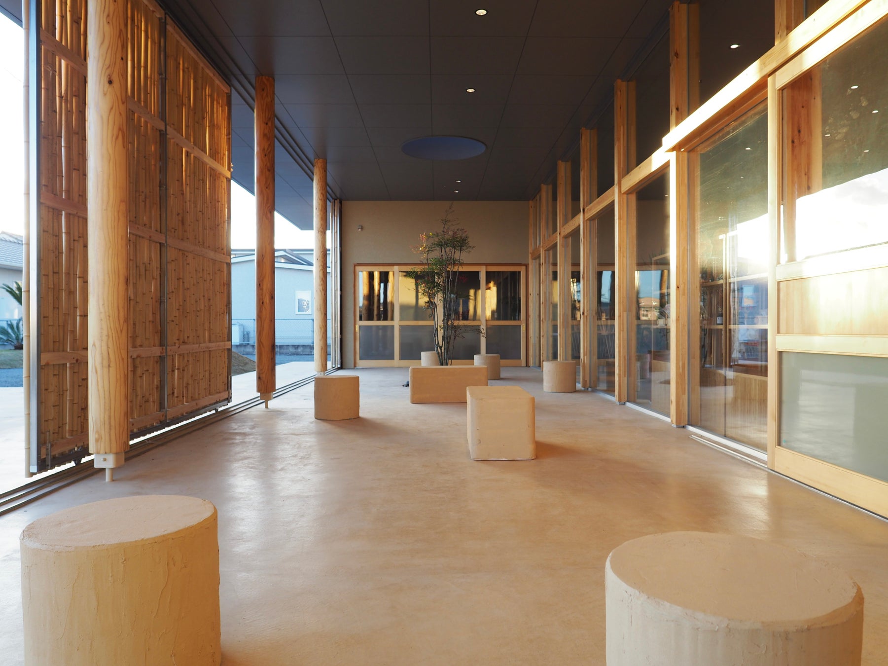 巨大なテラスとなっている軒下空間は、開放的な空間を作り出し、塗り版築で製作されたフレキシブルなオリジナル什器を使用して、人々がくつろげる場所となり、地域との交流を生むマーケットや軽トラ市などのイベント開催も検討されている。