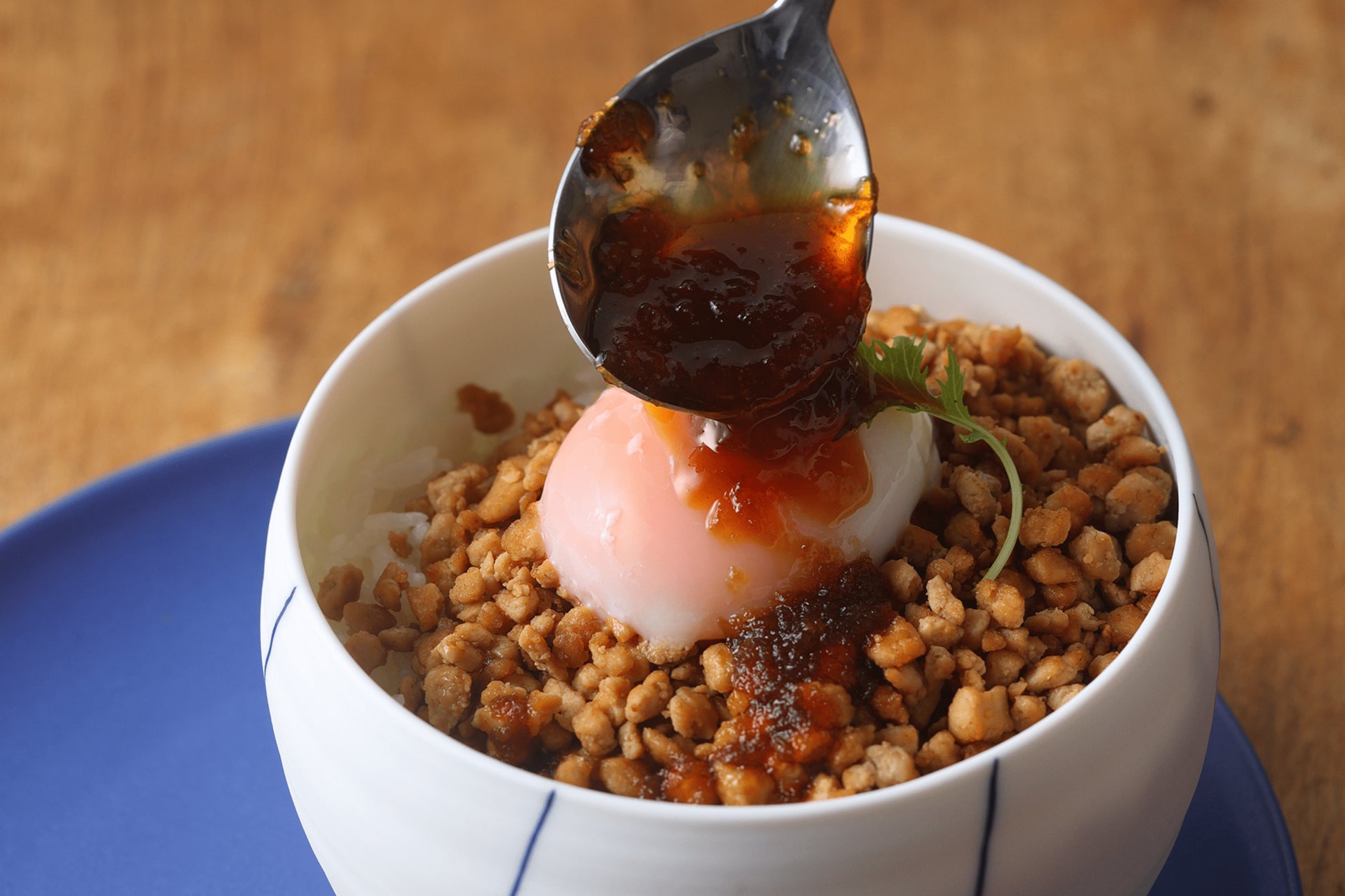 - 器にご飯を盛り、1と温泉卵をのせ、2をかける。