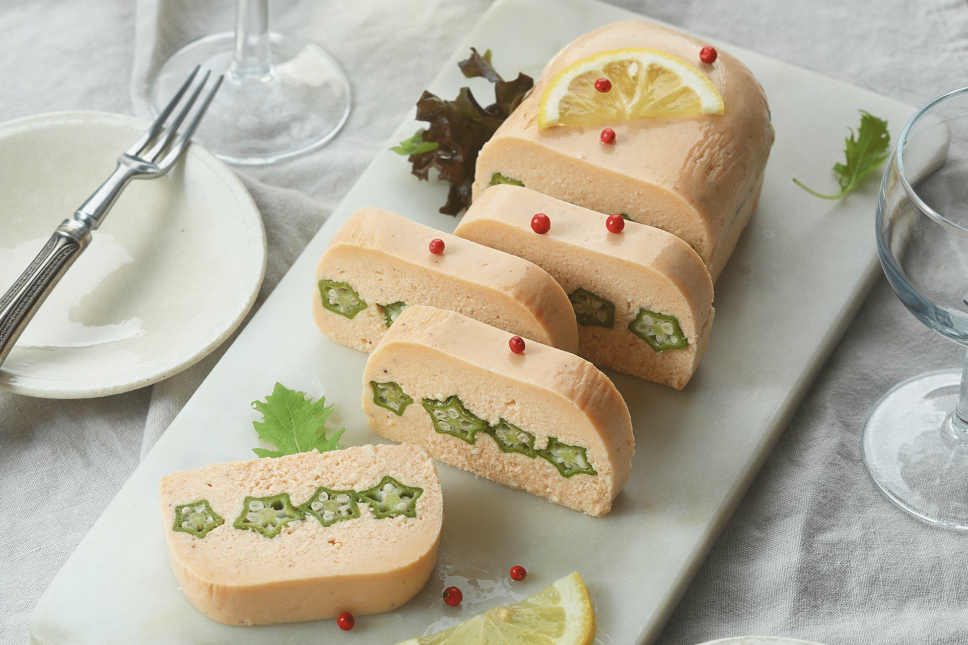 - 粗熱が取れたら冷蔵庫で冷やし、好みの厚さに切りレモン、ピンクペッパー、ミックスリーフを散らす。