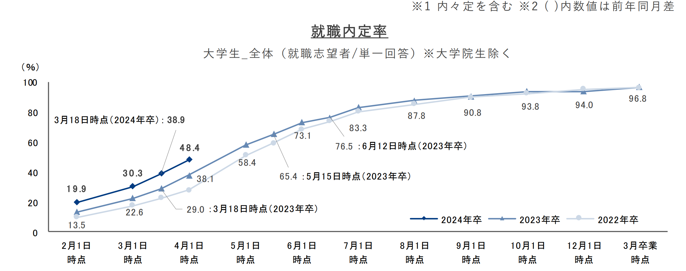 1,(株)リクルート 就職プロセス調査(2024年卒)「2023年4月1日時点 内定状況」