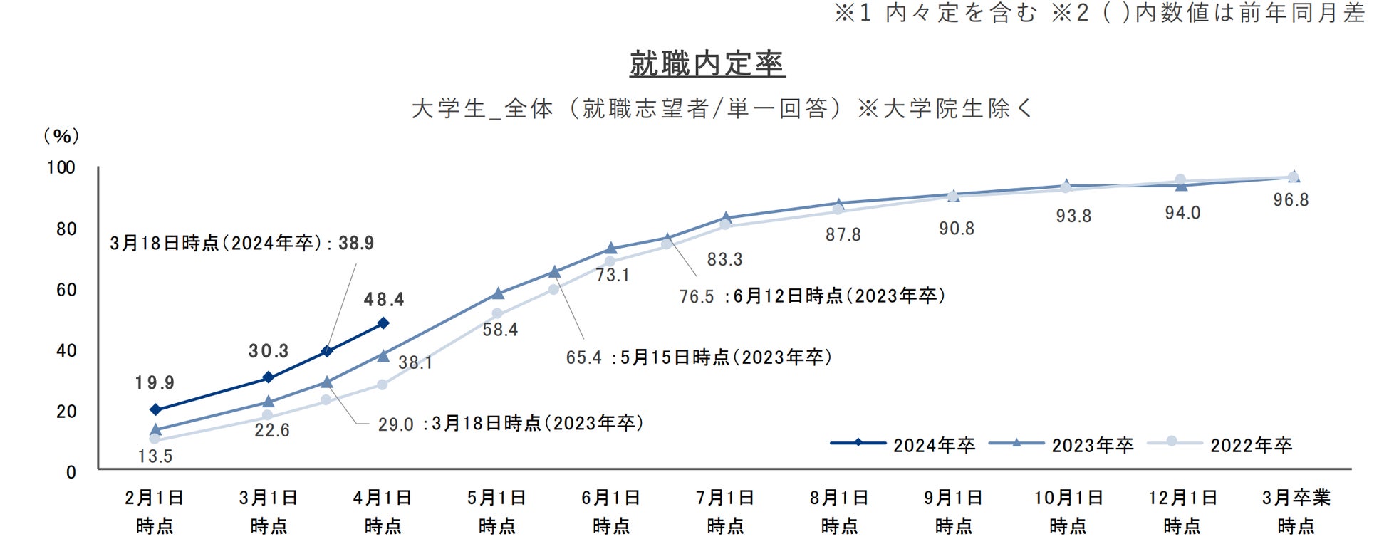 □4月1日時点の就職内定率:48.4%(前年比+10.3%)