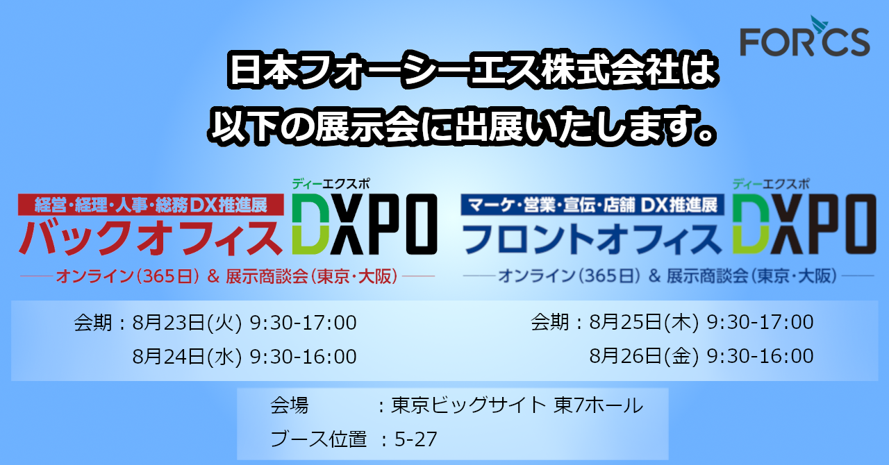 【8/23 ~ 8/26 開催】日本フォーシーエス、「バックオフィスDXPO東京 ‘22」、「フロントオフィスDXPO東京 ‘22」に出展