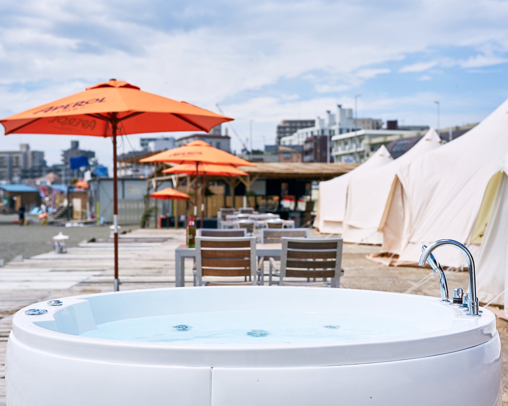 『Oriental Resort in SHONAN』とは腰越海岸に7月1日(金)プレオープンしたラグジュアリーなグランピングエリアやフードコートなど、約800坪の敷地を7つのエリアに分けた湘南エリア最大級の海岸施設です。
