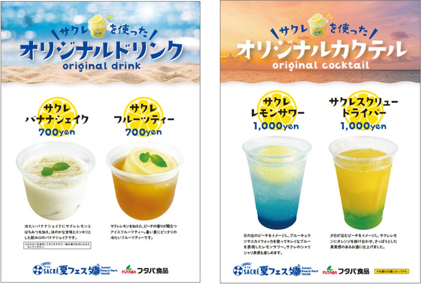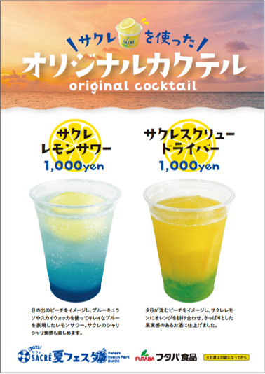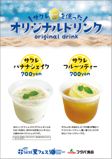 また、桟橋手前のキッチンカーにてサクレアレンジソフトドリンク2種類の販売も行います。暑い夏にピッタリのサクレオリジナルドリンクをお楽しみ下さい。