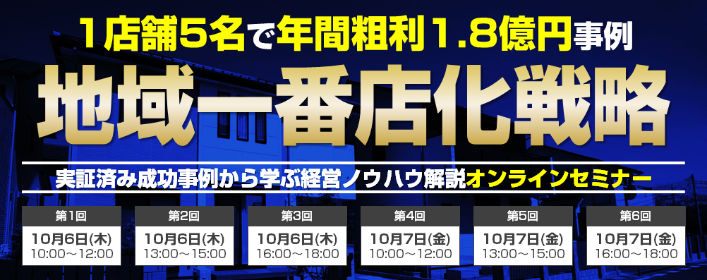 そしてこの度、住宅需要の急拡大やロシア・ウクライナ情勢の影響により、物件在庫が枯渇しているためにビジネスモデル変革を余儀なくされている状況を踏まえ、経営者・経営幹部(役員)限定として、『地域一番店化戦略セミナー(1店舗5名で年間粗利1.8億円の実証済み成功事例から学ぶ経営ノウハウ解説)』を開催することにいたしました。