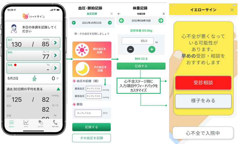 「ハートサイン」は、死因第2位とされる心疾患(うち主な原因が心不全とされる)患者の健康状況を管理することで症状悪化を未然に防止することを目的とするアプリです。患者が日々の血圧・脈拍・体重・症状などを入力すると、心不全の増悪リスクを自動判定し、早期受診を促すメッセージを表示するとともに、家族や医療者にも通知する機能を備えており、再発防止のための研究を三重大学らのグループと共同研究を行っているほか、ヘルスケアサービスとしての社会実装について本年度の AMED の事業にも採択されています。