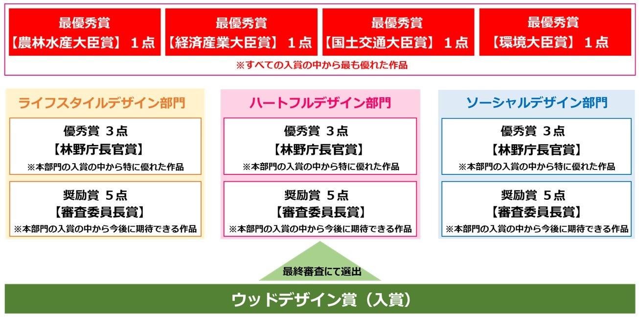 「ウッドデザイン賞2022」では、これまでの最優秀賞「農林水産大臣賞」に加え、新たに「経済産業大臣賞」「国土交通大臣賞」「環境大臣賞」を創設しました。この度、これら4つの大臣賞である最優秀賞と優秀賞、奨励賞を合わせた28点の上位賞が選ばれました。