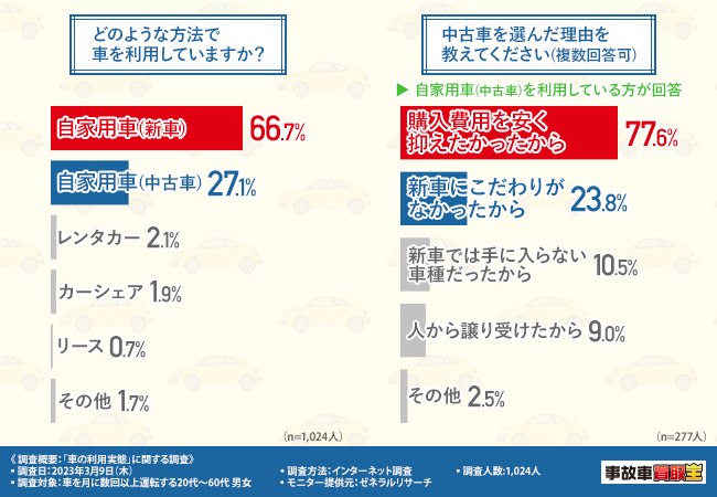 自家用車は新車の割合の方が多く、中古車の約2.5倍という結果となっておりますが、中古車を選んだ方の理由とは一体何なのでしょうか?