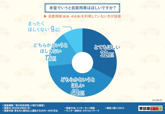 続いて、「本音でいうと自家用車はほしいですか?」と質問したところ、『とてもほしい(32.8%)』『どちらかというとほしい(40.6%)』『どちらかというとほしくない(17.2%)』『まったくほしくない(9.4%)』 という回答結果になりました。