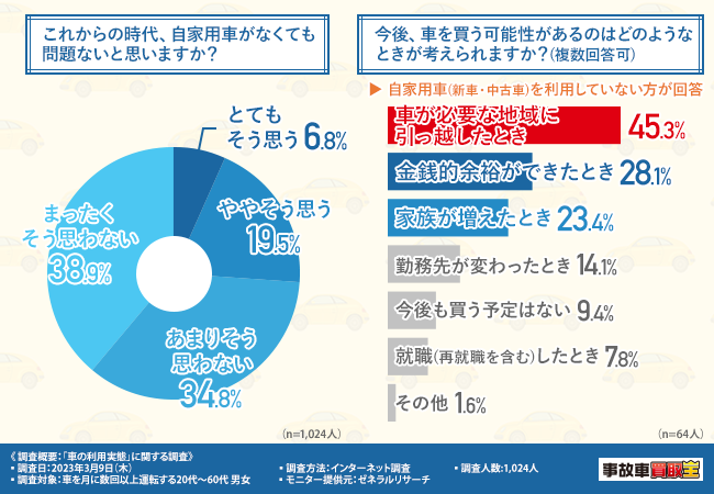 一方で、そういった移動手段がない場所に住んでいる方にとってみると、自家用車がないと生活が不便になってしまうため、必要だと考えていることが分かりました。