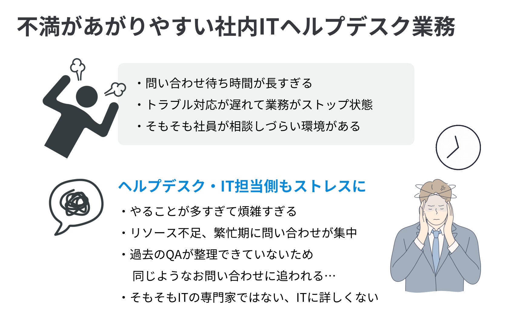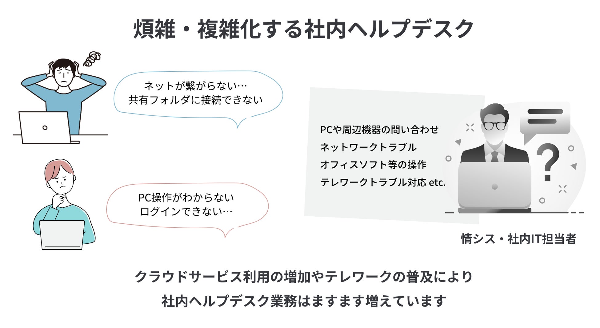 クラウドサービス利用やテレワークの普及により社内ヘルプデスク業務は増える一方で、複雑かつ煩雑になってきています。社内からの問い合わせに対しスピーディに対応できないと、非効率になり、業務が進まず生産性の低下にもつながります。