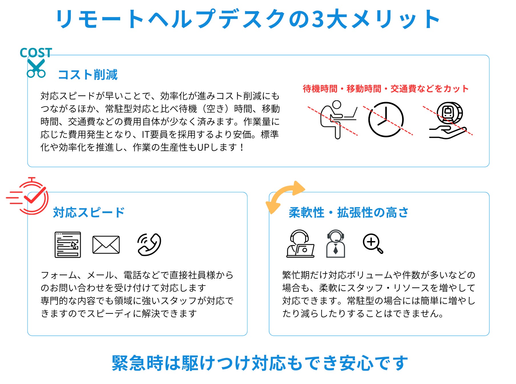 対応スピードが早いことで、効率化が進みコスト削減にもつながるほか、常駐型対応と比べ待機(空き)時間、移動時間、交通費などの費用自体が少なく済みます。作業量に応じた費用発生となり、IT要員を採用するより安価。標準化や効率化を推進し、作業の生産性もUPします。