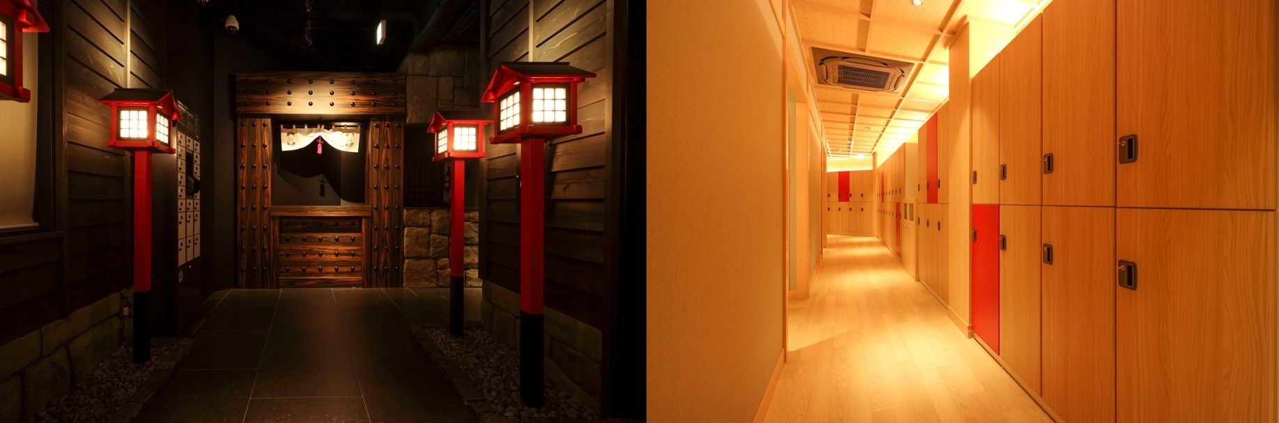 <「カプセルホテル NINJA&GEISHA」>は、現在再開発計画の進められる阪急淡路駅前の広場に誕生しました。海外からみたVERY JAPANESE をコンセプトに、シンプルながらも奥ゆかしさのあるわびさびを基調とした内装に加えて、煌びやかな提灯に照らされたラウンジで心ゆくまでお寛ぎいただけます。簡易宿所でありながらも日本の和空間と癒しを最大限“体験”できるエンターテインメント性の高い施設である一方で、セキュリティには万全を期しており、男女は完全にフロアを分けることで女性のお客さまにも安心してご宿泊いただけます。