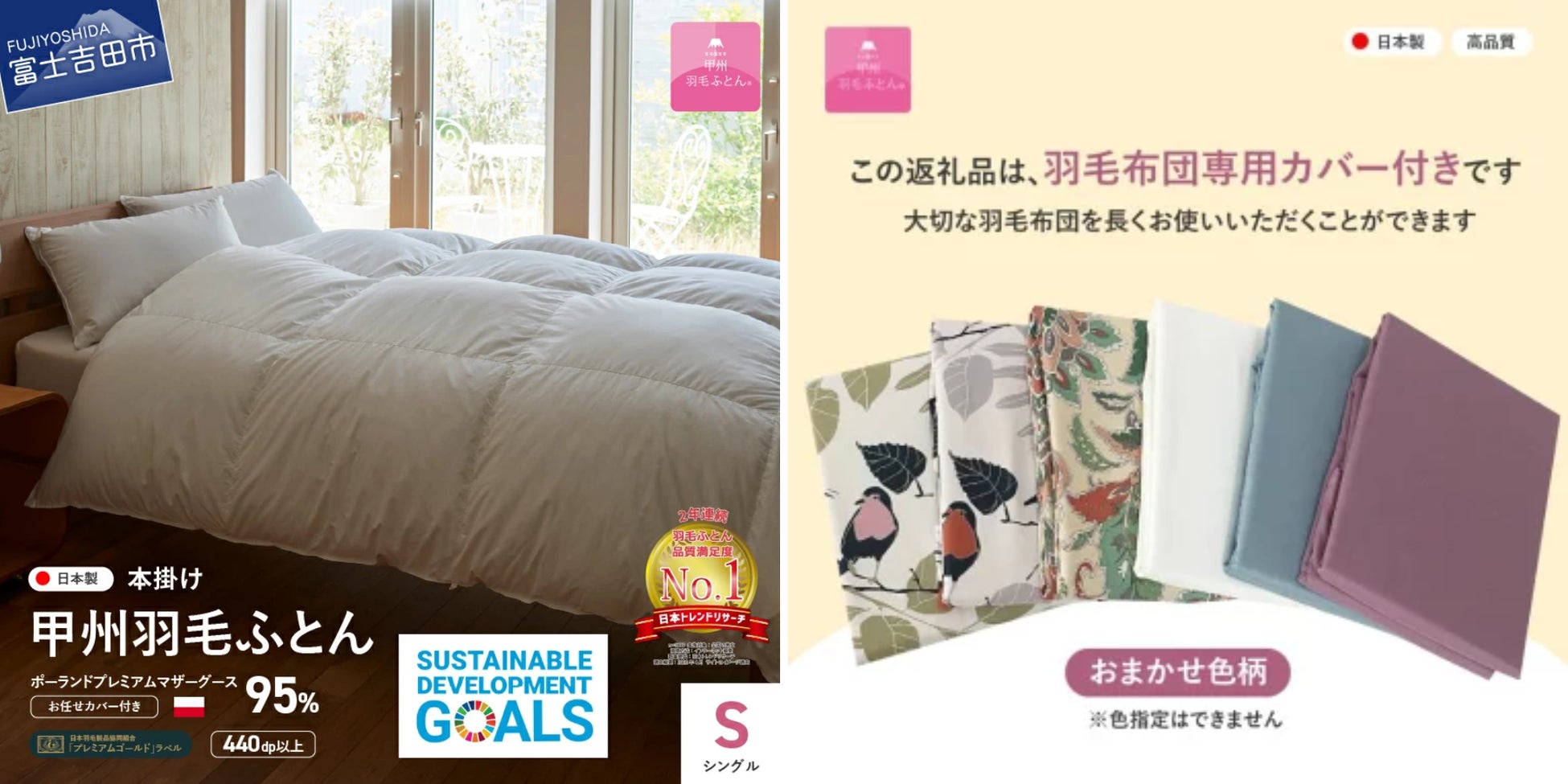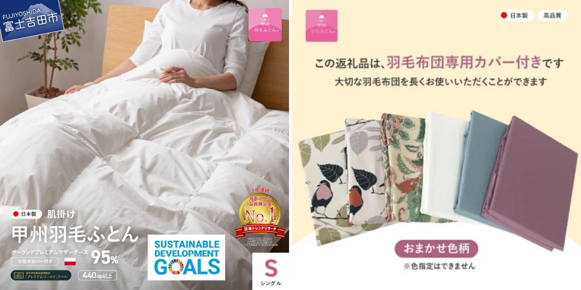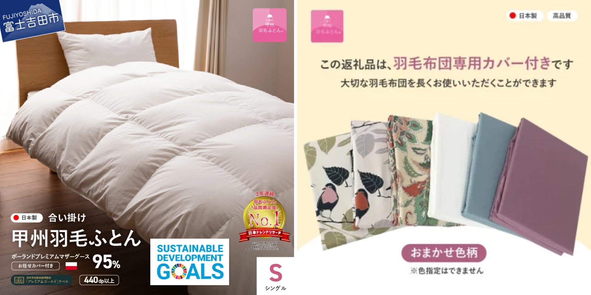 ▼寄付金額220,000円【甲州羽毛ふとん】合い掛けふとん 羽毛回収・再生サービス付き ポーランドプレミアムマザーグース95%(シングル)お任せカバー付き