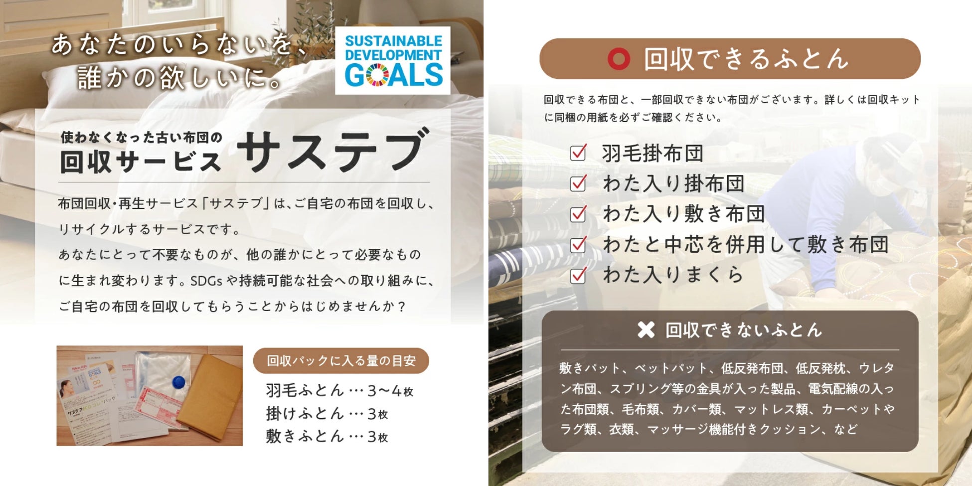 サステブとは、ご自宅の布団を回収し、リサイクルするサービスです。