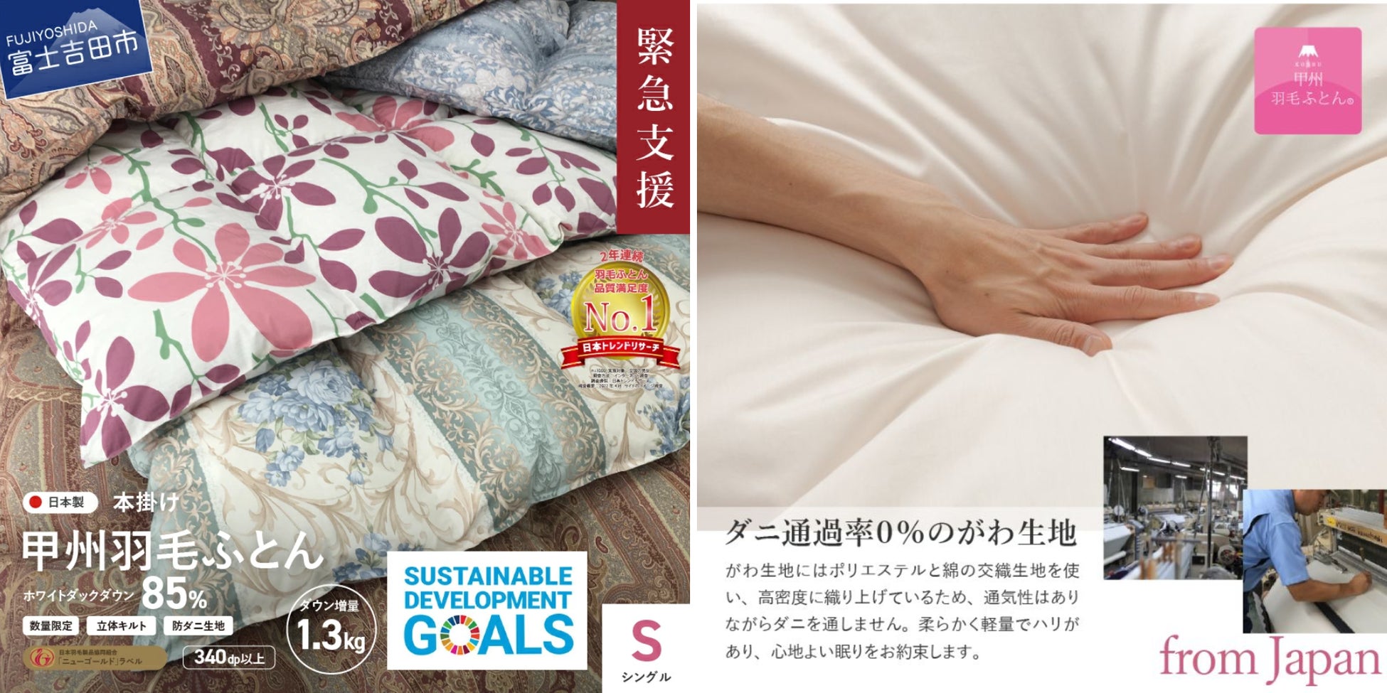 ▼寄付金額70,000円【甲州羽毛ふとん】本掛けふとん 羽毛回収・再生サービス付き ダウン85%増量1.3㎏(シングル/お任せ柄)