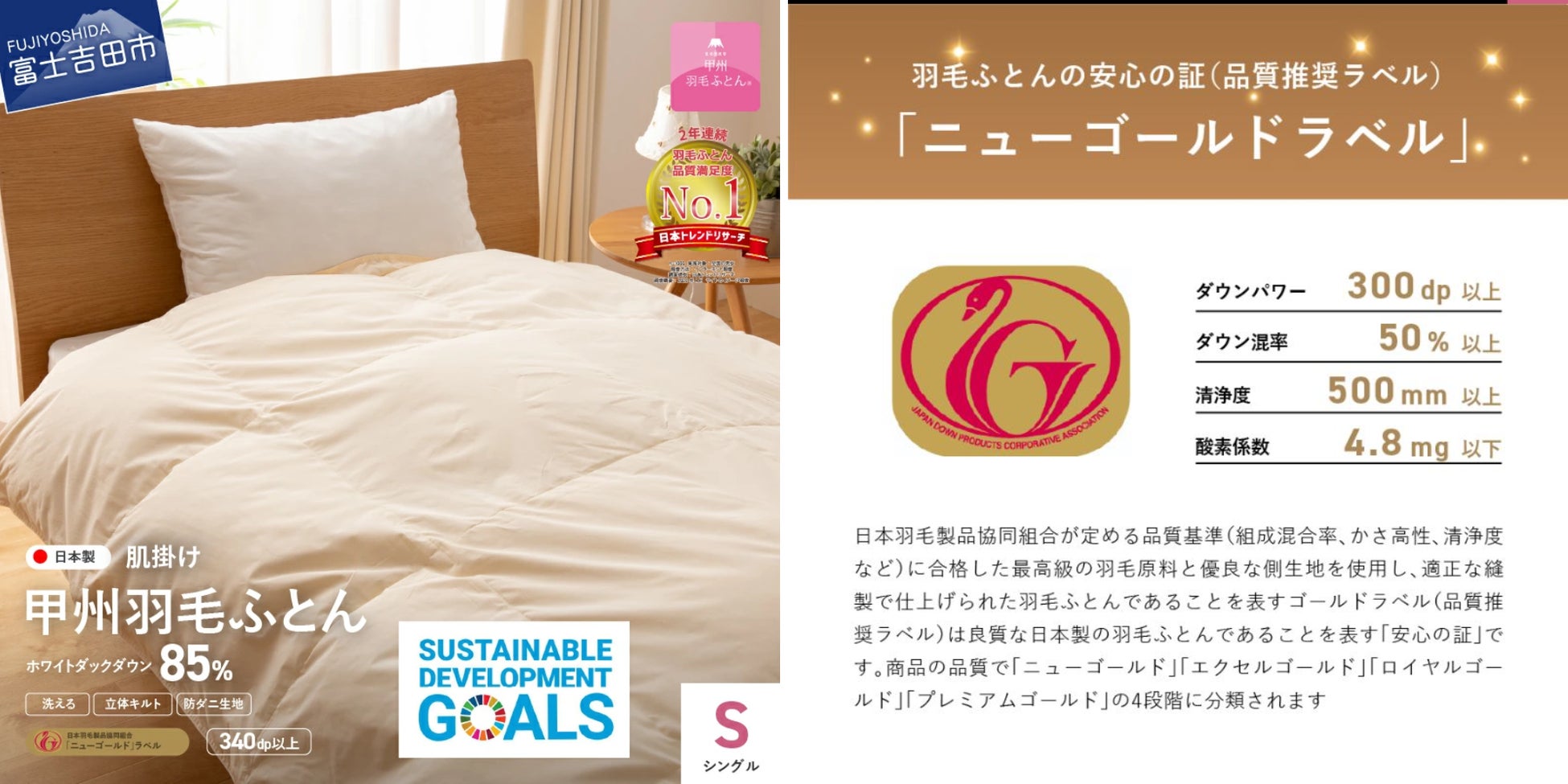 ▼寄付金額50,000円【甲州羽毛ふとん】肌掛けふとん 羽毛回収・再生サービス付き 洗える羽毛肌掛け(シングル)