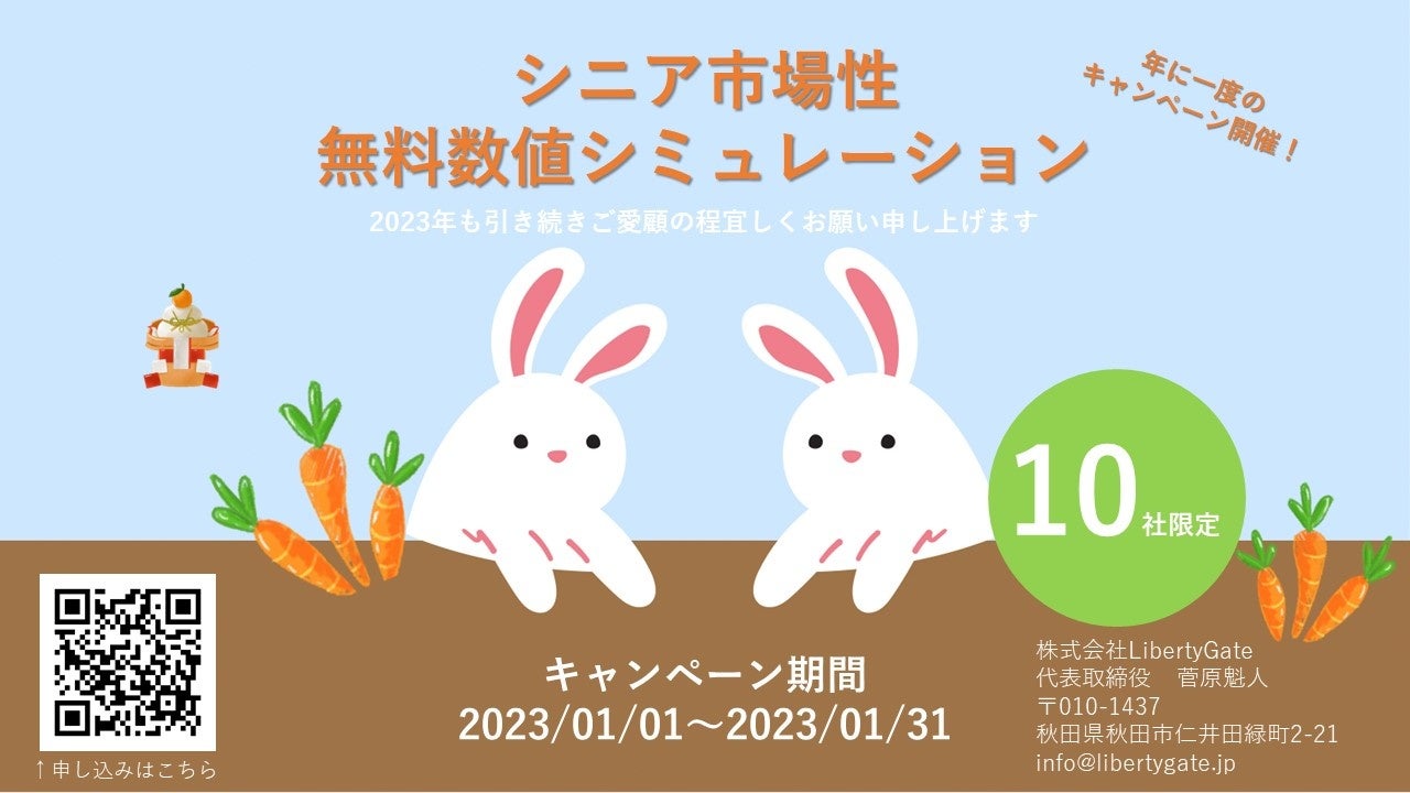 「高齢者になることが待ち遠しいと思えるような社会を創り出す」ことをミッションに介護保険外サービスを展開する株式会社LibertyGate(本社:秋田県秋田市、代表取締役:菅原魁人、https://libertygate.jp/)は、新年からシニア、介護市場でこれからビジネスを加速させたい企業向けに無料で数値シミュレーション、市場性診断を10社限定で実施致します。