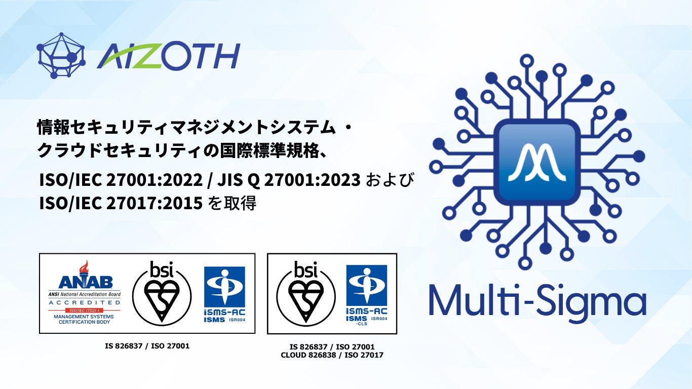 ノーコードAI解析プラットフォームMulti-Sigma®を開発・提供する株式会社エイゾス(本社:茨城県つくば市、代表取締役 河尻理恵子、以下「エイゾス」)は、情報セキュリティマネジメントの国際規格ISO 27001およびクラウドサービスのセキュリティ管理に関するISO 27017の認証を、BSIグループジャパン株式会社を認証機関として2025年9月30日に取得しました。今回の取得により、自社業務および提供サービスにおけるセキュリティ統制と運用基盤の継続的改善を推進します。