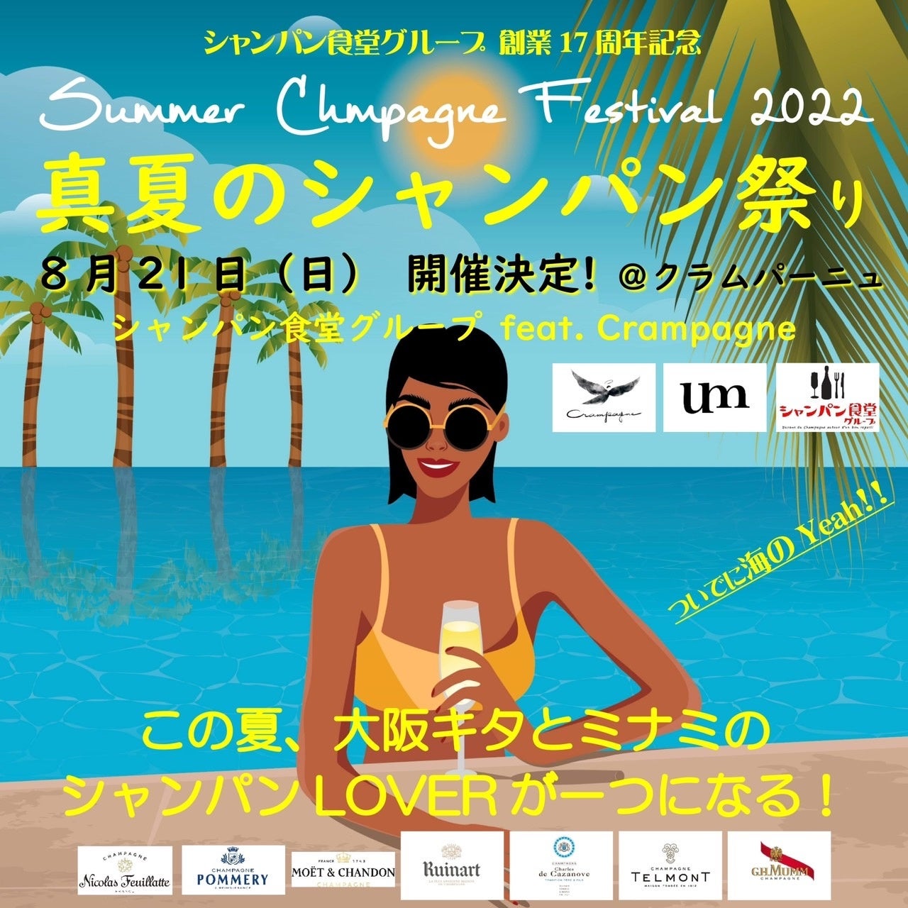 クラムパーニュを経営する株式会社um(大阪府大阪市、社長 米村公佑)とシャンパン食堂グループを経営する有限会社T・M(大阪府大阪市、事業責任者 元田武章)は、大阪・アメリカ村 クラムパーニュにて、2022 年8月21日(日)に、シャンパン食堂グループ創業17周年を記念して、真夏のシャンパン祭りを開催いたします。